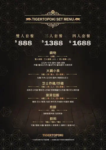 2016的最後一天,與好姐妹們相約一起到高雄義大跨年。雖然得知義大已經不會有演唱會只有煙火表演,但是我們這群女孩去義大跨年的目的已不是看表演感受氣氛,居然是要抒發沉積已久的『購物慾』!從下午四點起就開始在義大世界逛起,逛到晚上七點多才意識到肚子餓這件事,立馬到美食街去搜尋想要覓食的食物。只不過在當天跨年的時候人潮太多,每家店幾乎都要排超級久的,既然都要排隊了,就選了姐妹上次來說很想要吃的泰一格韓式料理。人潮眾多沒來的及拍菜單,所以直接抓了泰一格臉書的菜單照片泰一格就算不是假日,據說人潮也是相當多,原因是除了韓國來的品牌之外,還是人氣RM裡面李光洙代言的店家,店裡還有播放RM給客人看,讓大家的吃飯可以多點話題及娛樂。桌上擺好的餐盤,筷子還變成是我們常用的圓筷,要是韓國那種扁筷我還真的用的不是很習慣有提供白開水供大家使用,這個白開水在這家店扮演相當重要的角色,一開始這白開水是解渴的作用,畢竟逛了很久的街總是會渴的,等到了開始吃東西,這水就變成滅火的工具。友人說來泰一格最好是多人一起來享用比較划算,我們這次有四個人,選了三人套餐再補差額點選其他的東西~飲料有可樂、雪碧、果汁等選擇,我們選了可樂跟雪碧,友人說雪碧可滅火,但是經過實驗,可樂是不能滅火的......服務生送上來的小菜,除了中間的口味都偏重,不過口感真的很不錯,當下和友人一致覺得,可以來碗白飯嗎?(被毆蘿蔔乾我沒品嘗不知道口感如何鍋物我們選了部隊鍋,不過這裡的部隊鍋跟以往看到的還真不一樣,鍋子有點像是平底鍋的感覺,不深,服務人員送上來的時候還會告訴我們怎麼食用。這整個食用的過程還算ok,但究是這辣度也太辣了吧!辣到大家一直猛噴火狂喝水哈哈哈~火鍋小食選了拉麵,這拉麵煮起來口感還蠻Q彈的,不過吸滿辣汁也是頗辣的,像我們吃小辣的就有點受不了煎餅因為我不喜歡吃蔥,大家只好配合我選了泡菜煎餅。第一次嘗試韓式煎餅感覺還頗新鮮的,口感有點像是蔥油餅的感覺,裡面有豐富的餡料,不厚的煎餅吃起來不會太膩!紫菜包飯忘了選什麼口味,但是這紫菜包飯口感真的很扎實,淡淡的麻香味讓整個紫菜包飯增添香氣,除了色香俱全之外,味道也挺不賴的。原先還想說四個人點三人套餐這樣看起來怕吃不夠,沒想到吃到這裡我們都覺得飽了@@芝士炸雞我們選了特製韓醬,韓式炸雞就是要吃特製醬最對味。鐵板讓起司變得很綿密,服務生提醒要趁熱趕快食用,要不然等鐵板溫度沒了起司也會跟著定形。這個韓式炸雞一致讓我們四人覺得也太好吃了,撇開那起司不說,這雞肉也炸的太剛好了,不硬不軟,再搭上這特製醬整個就是絕配~這次享用泰一格的餐點,覺得口感上還算不錯,價位偏中上,如果三五好友來這裡用餐品嘗一下韓味我是蠻推薦的,而且還可以看RM,大家一邊吃一邊聊劇情覺得很不錯~…查看更多