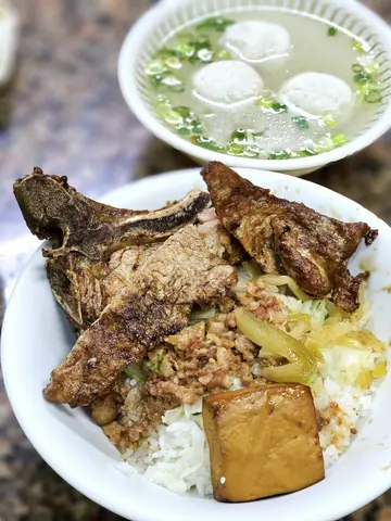 今天要介紹的是...聽說有藝人加持的排骨飯,不過這條街上,也真可說是臥虎藏龍,我和同事都到過這附近的餐廳吃飯,每間吃完我們的評價都覺得不錯,而今天要介紹的排骨飯,應該算是這附近的餐廳裡,最平價的一個選擇吧~看外觀感覺是間很老很老的店家,假如不是有網路上和電視上的推薦,我想我應該一輩子,也不可能特地跑到這個黃金地段來吃排骨飯~而店內賣的東西,跟一般的便當店沒有甚麼差別,除了原盅系列之外,不過此行的目的是要吃炸排骨和雞腿,所以只好這次只好先行略過他,不過我第二次來吃的時候,淺意識還是自動掠過XD主角排骨飯先行上桌,第一眼看的到時候,就知道這個東西不能常吃,會有礙健康,說這個好像太煞風景XD他的排骨並不是一般那種被打的薄薄的,且還裹上粉去油炸的類型,從照片中可以知道,排骨肉的部分相當的厚實,而且也沒有裹粉,是直接油炸,一口咬下去,肉汁慢慢地從肌肉纖維中流出,充滿整個嘴巴,肉質屬於有嚼勁的類型;配飯吃起來十分地過癮!!而在雞腿的部分,就沒有排骨這麼搶戲了,炸的雞腿還是麥當勞和肯德基那種有裹粉的比較好吃,因為這邊的雞腿有點炸得太老,所以吃起來不夠嫩,算是美中不足之處因為有點油膩,所以我還另外點湯來去油一下,湯喝起來就是普通的餛飩湯,相信各位看官在家裏面也可以輕易地煮出來XD總結:這間便當店的排骨飯滿值得推薦的,但是太過油膩是其缺點之一,不過這應該也算是他的原罪吧...其他的東西吃起來就比較沒那麼令人感到驚艷,假如人在附近,有沒有太多小朋友去吃旁邊的高級餐廳,不彷來吃一下有古早味的排骨飯吧~