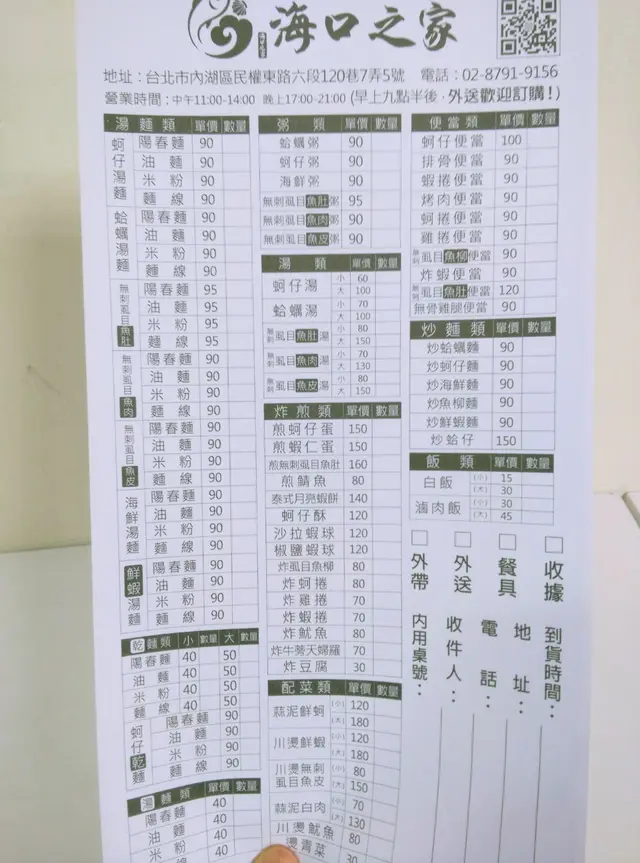 內湖民權東路六段與成功路交叉口附近~內湖最貧脊的美食區從小在這裡長大~附近真的是沒有好吃的小吃唯有鬍鬚張X薑母鴨X炭燒羊肉爐X炭烤土司這些店家都是偶而吃吃可以~無法當下班後的家常美味難得有一間這樣的海鮮小吃店~立刻與家人一起前往品嚐以小吃價位而言不是很便宜建議3~5人一起品嚐比較好點餐煎蚵仔蛋150X蚵仔酥120X煎鯖魚80X虱目魚肚160X川燙鮮蝦180X燙青菜60X魚皮湯150X蛤蠣湯100 鮮蚵無敵肥美~份量不多但是吃來很過癮魚皮料很豐富~份量不少~可以沾上芥末醬油品嚐2~3人品嚐剛好鮮蝦肥美新鮮~簡單川燙就很美味這不是蚵仔煎~鮮蚵蛋煎~簡單的烘蛋裡頭滿滿的鮮蚵~雖然不肥碩但吃來很過癮~口口有料大量蔥花很加分如果重視CP質~可以吃煎鯖魚台灣人的虱目魚肚非常香而肥美兩款煎魚都很推薦大小碗白飯差很多~男生可能大碗會吃不完簡單好喝的蛤蠣湯~蛤蠣肥美川燙的空心菜~蒜蓉醬油就很對味整體吃下來每個人平均三百多~認真說以小吃店不算便宜~但是美味與新鮮度還有料好實在上很推薦…查看更多