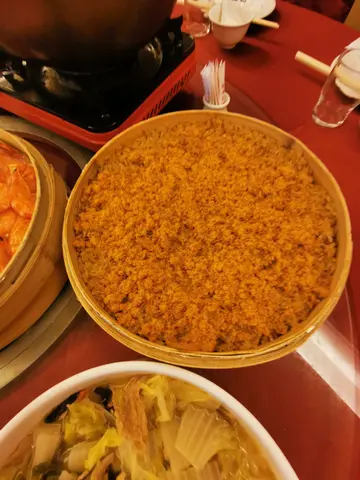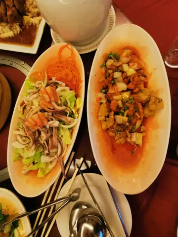 在印象中海霸王就是以“辦桌”及婚宴最為盛名,除了喜宴之外,就很少會到海霸王餐廳吃飯,這次很幸運有這個機會來到了海霸王餐廳(中山店)這裡用餐。海霸王餐廳(中山店)位於民族西及中山北路交叉口,從圓山捷運站1號出口直走到底再左轉就可以看到了。 因有訂位,一進門就跟帶位的服務人員說了名字後,馬上就帶位。這次用餐是在1樓,晚上時間用餐的人還不少,有些是聚餐,還有些是外國客人,這次被安排的位子剛好在門口旁,所以左右兩邊都可以看不少的客人。坐定位好,桌上已經有擺放著砂鍋燉雞及合時青菜。 這次找了同事一起來享用,因為人還沒到齊,所以用小火慢慢滾熟,偷偷打開看,一整隻雞,店家是用嚴選的土雞加上用百隻雞熬煮出的原味雞湯,味道很香,而後把旁邊的青菜都放進去煮滾。 終於等到砂鍋雞及青菜滾熟,服務人員來幫忙把雞分成小塊好方便食用。 同事幫忙服務,夾了一塊雞腿,咬了一口,雞肉肉質很Q及紮實,完全不會有,澀澀的口感,舀了一碗雞湯來喝,湯頭很清澈,香濃而不油膩,搭配著蔬菜融合著鮮甜的口感,湯頭真是棒。 和風中卷生菜 大隻的中卷底下是生菜,再淋上酸甜和風醬汁,中卷吃起來很清脆爽口,加上脆脆的生菜及酸甜的醬汁,會讓人有開胃的感覺。 紅燒圓蹄 店家選用好的豬蹄加上海霸王獨家配方的滷汁,所以圓蹄吸滿了滷汁,看起油亮油亮,送上來後,服務人員馬上幫忙“劃分”,讓我們方便食用。 咬一口肉,皮Q肉軟,吃上一口可以感受肉質的Q彈又有噣勁,而且還含有膠質,可以讓皮膚Q嫰Q嫰,不過呢?吃多感到油膩,同事說可以沾沾桌上的芥末醬,沾了後口感完全不一樣,別有一番風味。 櫻花蝦米糕 是嚴選東港櫻花蝦跟已經蒸熟的長糯米一起拌炒,吃了一口米糕,米粒顆顆分明,咀嚼中可吃到櫻花蝦的香味及鮮味,糯米吃起來不會軟爛,口感綿密且很Q軟,大家都吃的很高興。 清蒸鮮魚 魚一上桌,大家直呼好大一隻,海霸王採用的是烏魚,口感較為緊實,剖開平放的烏魚肉上灑滿蔥片,同事說吃起來味道有點像是虱目魚,而這道魚我只吃了一口,因為清蒸的手法吃起來略帶點腥味,雖然魚肉也很鮮美,但是味道過重,就讓人止步。 山藥鮑菇 在這之後,終於出現了這一盤青菜類~山藥鮑菇,裡面有紅、黃椒、四季豆、山藥及鮑菇等,整個吃起來味道很清淡且好入口,而炒出來的顏色也鮮豔漂亮,山藥及四季豆都很鮮脆,讓同事欲罷不能。 圓籠蒸鮮蝦 圓籠裡放著生菜,上面擺滿了蒸過後的蝦子,鮮紅色的引人想馬上想要品嚐,送上來時,服務人員告知桌上的芥末醬是用沾蝦子的,一瞬間大家覺得很糗,因為我們用來沾圓蹄,不過這個小插曲就在大家很迅速的剝蝦中不了了之,原味的蝦子吃起來很鮮甜,也很新鮮,沾著芥末的蝦子吃起來更是甜中帶點微辣,有沒有沾醬,其實味道都很好。 鮮魚芋香鍋 這道送上來後,香味馬上四溢,服務人員說要滾約10分鐘,打開後,切成塊狀的鮭魚肉有用油炸過後封住美味,加入米粉、芋頭、還有燕餃等一起煮熟。 這道鮮魚芋香鍋上頭灑上了蔥花及油蔥等來提味,吃入嘴中帶著濃郁的油蔥味,鍋裡滿滿的食材每吃一口都有不同的感覺,鬆軟芋頭、很Q彈入口米粉、鮮嫰的炸魚塊,每一口不同感受,濃郁清香不油膩的湯頭更是讓人欲罷不能。 最後就是中式美點~ 吃完主食後的甜點是小桃包,Q軟粉色討喜的小外皮,吃起來很鬆軟,對中扳開後,內餡是棗泥,吃起來不甜膩,很適合當飯後甜點也不為過。 最後就是人人知名的~甜蜜情人果,這個是從有記憶吃過後,就常想念的,青芒果切片拌上透心涼的清冰,青芒果的酸甜溶入冰中,吃起來酸甜口感,讓人會有戀愛的氛圍,很適合做為餐後的END。 以整體來說,環境算是很乾淨,空間也很廣濶,服務人員的速度也很快,雖然晚上用餐的客人很多,但是態度還是很好,食材方面也很新鮮,以這樣子一桌的價位來說,其實還算中肯,很適合家庭或朋友聚餐,謝謝店家提供讓人懷念“古早味”的味道。(以上為個人吃食後感想,僅代表個人之意見) 查看更多