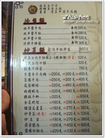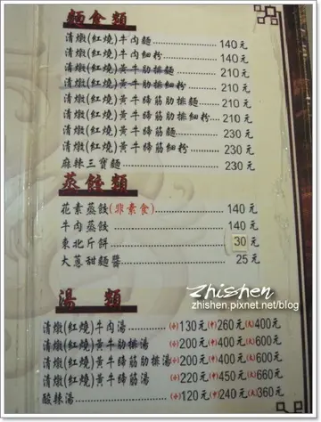 牛肉蒸餃 / 牛筋紅湯 醋溜高麗菜 / 半筋半肉清麵 涼拌牛筋 / 各式小菜 / 合菜戴帽 / 好吃的牛肉麵 / 京餅 / 京醬牛肉絲 / 京醬肉絲 / 姑嫂蝦肉 / 招牌斤餅 / 招牌紅燒牛肉麵 / 招牌清燉牛肉麵 / 炒青菜 / 茄子 / 捲餅 / 清燉牛肉湯 / 酸辣湯 / 京醬黃牛肉絲 / 黃牛肋排麵