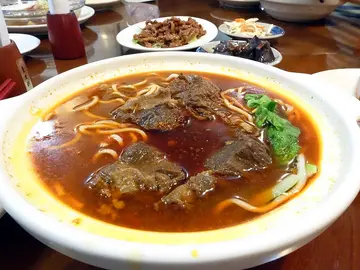 星期六晚餐想簡單吃個牛肉麵解決,後來決定了口袋名單中的這間「清真中國牛肉館」來用餐,怕沒有預約晚到了會在外頭頂著太陽烤人肉,所以魯是提早出門,開門時間一到就已經在門口待命XDΩ清真中國牛肉館是在延吉街靠近忠孝東路的巷弄裏面,以外觀來看感覺就是很一般的牛肉麵小館子,魯本來也是直接入座沒有想太多啦,不過剛開門沒幾分鐘,客人就從門外不斷的湧入,不到五點半店內就已經客滿了,不到一下子便可了解店家受歡迎的程度ΩMENUΩ紅燒黃牛蹄筋肋排麵 210塊大洋紅燒湯頭有著濃郁五香味,喝起來又溫潤順口,直覺就像是魯家附近「老媽子牛肉麵」的薄鹽溫順版本,路數相同不過價錢稍高,口味上也稍微精緻一些,裏頭的蹄筋、肋腩肉…等四種肉塊各有其口感和特色,Q軟的細麵吸飽的湯汁也有著豐富的味道,麵湯及牛肉之間呈現出一種自然的協調感Ω清燉黃牛蹄筋肋排細粉 210塊大洋清燉裏頭的三種肉塊和蹄筋和紅燒有著相同的軟嫩口感,可喜的是清燉的湯頭沒有太鹹的問題,清新的牛肉香氣蘊含湯中,或許和紅燒的湯頭相較是比較淡味些,不過倒是清爽順口的恰如其份,像牛爺就是滿愛Ω蔥爆牛肉(小) 200塊大洋& 東北斤餅 30塊大洋蔥爆牛肉是魯點來搭配斤餅品嚐的菜色,單吃的話會感覺牛肉片本身的芡勾得比較有厚度一點,不過有醬汁調味和蔥段、洋蔥片等香氣的附著,風味不差,單吃、搭配皆宜Ω東北斤餅 30塊大洋斤餅最顯著的應該就是它的Q彈口感,微微的麵香,暖暖的溫度,拿來包挾蔥爆牛肉十分對味查看更多