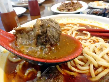 令人一再回味的好味道...約莫中午離開了姚賓掏耳,路上好幾間牛肉麵店、沿途聞著牛肉湯的香氣,肚子餓的咕嚕咕嚕叫。但是,又不願隨便找間麵店,一路忍到延吉街的清真中國牛肉麵店才肯罷休。國父紀念館站2號出口出來,天空飄著細雨,撐起了傘邁步朝著牛肉麵店前進。星期日中午已經過了中午用餐時間,店內還是客滿。一張圓桌、兩個國籍、三組客人併桌吃飯,在這間餐館似乎是相當平常的事情。看著店內滿滿的客人,先點了兩個小菜墊墊底、壓壓胃,免得肚子叫得太大聲,驚嚇到其他客人。東北斤餅(京醬黃牛肉絲)因為餅皮是手工做的,等了許久都沒上桌,反倒是 京醬牛肉絲先被端上桌,就先當作是一道菜,開動吃了。京醬牛肉絲味道相當入味,要是有一碗白飯,肯定扒個精光。沒多久,斤餅送了上來,相當有口感,就算不包著京醬牛肉絲,也可算是一道單品享用。鹹香具口感的斤餅,搭上鹹甜味的京醬牛肉絲,青蔥的提味,就一句話...舒服。清燉牛蹄筋肋排麵淡淡的牛肉清湯及香料的味道,相當舒服。不像一般時下重口味的牛肉麵,這一口湯喝下,洗去了剛剛雨中走過來的煩悶感。紅燒牛蹄筋肋排麵這道麵對足了兔子的胃口,粗麵條再加上那辣度、香氣,這個組合太棒了。這道麵說是川味應該更為貼切...牛肉及牛筋燉的軟嫩,一咬就劃開了。喜歡吃有口感或是牛腩的人,或許會不對味。但是,對於喜歡入口即化的人來說,可是享受。從西門站一路堅持到國父紀念館站,沿途好幾間牛肉麵館,湯頭香氣的誘惑撲鼻而來。幸好都有ㄍㄧㄥ住,不然,可能會恨死自己不懂堅持二字的重要性。走出麵店,颱風天、飄細雨、心情卻滿足且愉悅。撐起傘,朝松山菸廠邁步前進...店家資訊店名: 清真中國牛肉麵食館電話: 02-27214771地址: 台北市延吉街137巷7弄1號查看更多