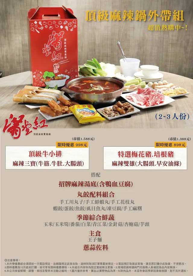 【在家也可以滿堂紅】年菜輕鬆上桌!外帶2~3人份滿堂紅頂級牛小排超值組合套餐,食材澎湃麻辣好過癮!! Penny小食光等級32015-12-18245 瀏覽 關注 仁愛旗艦店台北仁愛店(捷運忠孝敦化站3號出口)店鋪地址:台北市大安區仁愛路四段228-4號2樓訂位專線:02-2701-6669營業時間:平日午餐11:30~15:30、平日晚餐17:00~01:30週六、周日與例假日11:30~01:30其他分店訊息:官網天冷就是要吃鍋啊!!如果是麻辣鍋的話就更祛寒了滿堂紅的麻辣高湯飄香超過10年,每家分店幾乎是一位難求,現在在家也可以輕鬆享用今年滿堂紅照例推出外帶禮盒,今年的組合分別是:頂級牛小排(NT998)和特選梅花豬/培根豬(NT898)penny在前一天電話預約,隔天傍晚到仁愛店取貨(↑DM節錄於滿堂紅FB) 因為是到了現場服務人員才組合裝箱,所以要等約三分鐘左右,大小適合的紙箱,摩托車也可以輕鬆帶走喜氣洋洋的紅色禮盒,用來當除夕圍爐的年菜也相當應景 不過penny等不到除夕了,現在就要熱呼呼地來上一鍋!!登登登!!就趕緊開個箱吧! 裡面有一大包的麻辣鍋湯底(裡面還有鴨血豆腐),一大盒牛小排、 麻辣三寶(牛筋牛肚大腸頭)、丸餃配料和新鮮時蔬,鮮蝦丸和花枝丸各一大盒、加上兩包王子麵,還貼心地附上蔥花和蒜泥滿堂紅的招牌麻辣高湯官網上說是以牛大骨、丁香、肉桂、花椒等近三十種中藥材,以及洋蔥、胡蘿蔔等新鮮食蔬,慢火熬煮5~6小時,同時將數十種辛香料持續拌炒1.5小時,再將兩者混合一同熬製,全程至少需要8小時的製程而我們只要輕鬆到店取貨就可以吃到真的太幸福了麻辣湯底上面有一層辣油,怕辣的朋友可以撈一下,可以稍微減辣,不然真的是會辣到頭頂的喔!! 除了食材新鮮外,滿堂紅的牛肉是經過美國肉協的「白金級美國牛肉」認證,替肉品提供實質的保證,店內牛肉皆為choice以上水準。 penny把高湯放到砂鍋中熬煮,其實滿堂紅給的高湯分量充足,我們一家四口只放了一半再把相關的丸類、豆腐、玉米、芋頭、杏鮑菇和白菜先下鍋一起煮開再放上桌持續加熱其他的配料還是擺滿一桌,雖然DM上說是2-3人,但四人吃還是綽綽有餘的 大家可能想火鍋料不是大同小異嗎?我們也會到市場上買冷凍的蝦餃燕餃蛋餃什麼的,但是滿堂紅的手工丸和鍋物,吃起來沒有肉的腥味,麻辣三寶的牛筋下鍋稍微煮一下就可以軟Q入口,大腸頭和牛肚也滷的恰到好處,一樣川燙一下就可下肚份量也是給的十足,penny家也是分成兩餐才吃完。 牛小排的油花和瘦肉比約為3:7,清涮一下吃起來肉質軟多汁,讓人忍不住一片接一片 另外還要特別的提一下的是滿滿鮮蝦的手工鮮蝦丸,蝦子沒有完全打成泥,隱約的還可看到切丁的蝦段因此蝦丸吃起來有兩種有層次的口感 麻辣鍋不可或缺的王子麵,滿堂紅也準備了2包 最後雖然沒有甜點,但是滿堂紅貼心的準備了手工麻糬,煮軟後微甜軟嫩的口感,在家吃麻辣鍋一樣有著美麗的ending!! 雖然圍爐吃鍋是個方便的好點子,但是蔬菜的洗洗切切也是需要一些時間,在冷冷的冬天碰水也好凍滿堂紅的外帶禮盒可以讓我們優雅上菜,輕輕鬆鬆的用餐!!不吃牛肉的朋友也有梅花豬或培根豬的選擇年菜圍爐也可以考慮喔!!【本文為邀約體驗文,但口感為真實感受】如果您喜歡penny這篇文章,歡迎到penny小食光輕旅行粉絲頁按讚或留言隨時會更新美食旅行的最新資訊喔!! …查看更多+ 32以上食記乃用戶個人意見,並不代表OpenRice之觀點。讚好分享【在家也可以滿堂紅】年菜輕鬆上桌!外帶2~3人份滿堂紅頂級牛小排超值組合套餐,食材澎湃麻辣好過癮!! 滿堂紅頂級麻辣鴛鴦鍋 仁愛旗艦店 https://s.openrice.com/cHRTm027EO000檢舉 張貼 評分5味道4環境4服務4衛生4CP值推薦菜頂級牛小排、手工蝦丸、麻辣三寶、手工麻糬、麻辣鍋用餐日期2015-12-10等候時間3 分鐘 (外帶)用餐優惠試吃活動