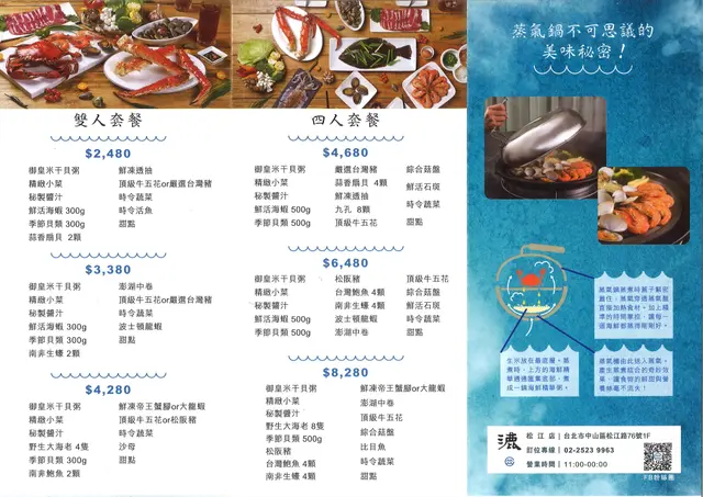 漉 海鮮蒸氣鍋 (台北) 網址: https://s.openrice.com/cHRSm02fyW300 地址: 台北中山區松江路76號1樓 電話: +886 +886225239963