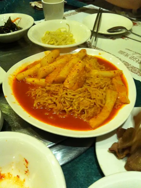 amy學過幾堂韓國料理,但只在家做過一次泡菜,每次上課時都覺得“還挺簡單的嘛!”,但回家後就完全沒有想要動手的念頭,最近突然開始對韓國料理有興趣,在還沒有動手自己做之前,還是先四處吃吃好了。忘了在哪裡看到這家『漢陽館』的介紹,當時就順手輸入手機裡,最近終於派上用場了。 這天不到12點就來了,店內還沒什麼客人,結果一到12點用餐時間就一直陸續有客人進來,很快就客滿了,還蠻令人驚訝的。 入座後服務生很快地送上茶水。 點好餐後服務生先送上一些小菜和包肉的生菜。 泡菜一上桌amy就覺得應該不是自己喜愛的那種韓國泡菜,因為賣相看起來像是醃了很久,果然味道很酸且口感偏軟,amy覺得這種泡菜比較適合拿來料理,不適合單吃。 這個應該是綠豆粉凍,amy有學過,綠豆粉凍本身沒有味道,口感像比較脆的碗粿,醬料是醬油加點蔥油、辣椒,味道很普通。 黃豆芽也是一般般,調味都算偏淡,有種忘了放鹹的感覺。 小黃瓜還行。 洋蔥好像是生洋蔥拌了辣椒粉就上桌了,生澀味有點重。 生菜還可以,沒有枯黃葉。 這天想吃烤肉,點了牛小排來嚐嚐。 這裡可以請服務生幫忙烤,但人多的時候最好還是自己來,不然服務生跑來跑去很容易就忘了你這兒還在烤肉。 烤好後會把牛肉剪成小塊狀。 牛小排還不錯,用生菜包著吃,搭配泡菜或辣醬還蠻可口的。 炒年糕泡麵原本很期待的炒年糕泡麵,結果還蠻失望的,因為吃起來只有辣的味道,連鹹味都沒有,我們吃的時候只好自己再加些醬油。 蔬菜煎餅這個煎餅跟平時吃的不太一樣,口感比較乾香一點,還不錯吃。 這天離開『漢陽館』的時候心情有些低落,可能是期望太高導致失望太大吧?amy沒去過韓國,不知道什麼樣的味道才是正統的韓國料理(但老爺以前常去韓國,他說跟他在韓國吃到的有些差距....),只能說這家的料理不對我的味。繼續尋找好吃韓國料理中,也請大家幫忙推薦。…查看更多