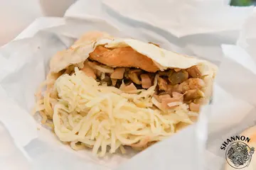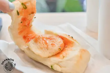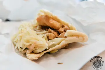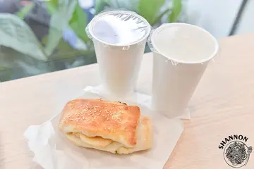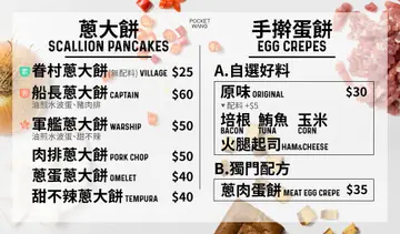 某日S在網路上看到了說這是吳宗憲他女兒開的店,賣燒餅耶!要試試看嗎?然後我們就來了....哈哈哈到了門口看到裡面滿滿的人,說實話這個招牌並不像是賣燒餅的,再來覺得這個招牌這配色其實也很不...明顯!裡面人真的很多排隊超長有些要等座位也非常的壅擠!有個名爸爸的人開個店可能會變這樣😂不過還好他們燒餅瘋狂出爐好給客人,所以看似排隊長卻也沒有等待太久,當時去詢問哪邊有餐巾紙,結果要去櫃檯拿而那位先生只給我兩張薄薄的...蘿蔔糕 25 NTD、鮪魚蛋餅 35 NTD、古早味紅茶 25 NTD 及斑蘭葉豆漿 30 NTD蘿蔔糕看起來是蠻普通的,吃起來是蠻有點彈性的外皮微微酥香氣普通,我個人喜歡的口感是少點漿多點蘿蔔絲口感偏軟但可以煎的酥的那種!鮪魚蛋餅就是和外面早餐店一樣,味道就是罐頭鮪魚所以表現普通,蛋餅皮的口感是蠻OK的有些彈性,S說他們是自己手擀的!斑蘭葉豆漿這品項很特別,這喝起來有一點粉粉的、有點像不會太甜的蜜豆奶,古早味紅茶我個人認為有點淡,但確實有古早味紅茶的感覺!招牌口袋 45 NTD、海軍口袋 60 NTD招牌的內容物有筍絲、豆乾、酸菜、小黃瓜、榨菜、蘿蔔乾、油煎水波蛋及甜不辣,不過不能平均包好這個口袋餅有點難享用,畢竟前面一坨筍絲看起來是不太可口的...終於都吃到每一樣料的時候覺得其實味道無法互相融合,僅覺得豆乾算蠻香的!海軍的內容物有筍絲、豆乾、酸菜、小黃瓜、榨菜、蘿蔔乾、油煎水波蛋及豬肉排掀開來看一下料全部擠在後面,前面同樣是一坨筍絲...整體和剛剛的招牌差不多味道都是分開的,豆乾有香、只是豬肉排也是早餐店的料,這樣一份60元我實在覺得可能點個招牌就好!甜不辣蔥大餅 40 NTD一翻開我有點傻住了因為無配料的25元,搭配一片甜不辣和醬15元我覺的有點貴外,覺得其實點蔥大餅(原味)就好了,因為蔥大餅的彈性是還不錯的,甜不辣就沒什麼香氣可言所以...原味即可!整體來說我覺得表現很一般普通,部分面皮來說擀得還算不錯,但其實特別來這邊排隊吃的話就免了吧!…查看更多