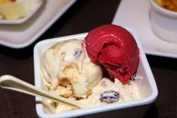 用完餐後沒有甜點,總覺得少了什麼,最近一次吃到令人驚艷的餐後甜點,居然是在神旺飯店一樓的伯品廊,印象中,這裡最早以前是石鍋裕的QUEEN ALICE,當時是一家很高級的法國餐廳,後來才轉型為一個吃「包肥」的餐廳,所以我甚少來這裡用餐。因為認識米兒的人都知道,米兒非常不喜歡吃包肥的! 但是一個識途老馬卻跟我說:「笨笨的,這裡可以吃到主廚特製的歐陸菜色,而且價格相當實惠!」果然如老馬所言,不到二千元的套餐吃下來驚喜不斷,而且用料相當實在,從鮑魚、黑松露到牛排一應俱全,最重要的是每一道餐味道都可圈可點,吃得出主廚有花了心思去做。 但是,最讓我意猶未盡的,是餐後的「法國蜜桃佐香草冰淇淋」,這是用整顆法國進口白桃製作,甜美中帶著清新香氣的白桃,口感脆嫩,淋上鮮紅閃亮的莓果醬汁,搭配綿密的冰淇淋,盛在透明的高腳杯裡,看起來就很誘人,與新鮮莓果一起享用,讓人幸福感十足! 忍不住問了服務人員可否單點?嘿,沒想到真的可以耶!看來下次可以專程來這裡,好好享受一客既好看又好吃的美味的甜點了! 歐~忘了寫,這個套餐是1980大洋,主菜'甜點二選一~~我和胡姊各吃一分~~~~哈~~冷獅魚薄片.芥末子橄欖油。使用油脂豐富的獅魚切成薄片,醬汁是加了芥末子的酸香橄欖油,上面搭配一點魚子醬和生菜,整個吃來柔嫩軟滑,很是開胃~自家烘焙的麵包,每一種都很好吃,尤其是芝麻脆片,會想讓人多吃幾片呢!!! 嫩悶南非燉鮑魚松露蛋乳凍,這個味道讓我想起了一些頂級鐵板燒裡供應的松露蒸蛋,底下是嫩滑的蒸蛋,淋上松露醬汁,鹹香甘美,而中間的亮點就是那個燜煮得彈軟的南非鮮鮑囉~~偶爾吃得到的節瓜,也為整個口感增色不少~~卡布奇諾蘑菇湯,雖然到處都喝得到這個湯,不過這裡的蘑菇湯水準可不輸其他地方的呢~~ 香煎深海白鯰魚.香檳鮭魚卵蝦夷蔥(搭白蘆筍),難得吃到的白鯰魚,味道真的好令人驚艷,讓米兒忍不住要求主廚拿魚出來瞧瞧,可惜後來沒拍好~~不過這個用香檳醬汁去提味的白鯰魚,肉質超軟,但微微的彈性卻突顯了它的鮮美,鹹鮮的鮭魚卵剛好為它增色提香,好一道令人拍拍手的好菜啊~~ 主菜搭配的白蘆筍,是用簡單的奶油醬汁去燴煮,仍保有白蘆筍本身的清甜,醬汁又不會過搶,味道相當誘人~~ 精燉牛舌.鴨肝.羊肚菌菇醬汁(搭白蘆筍),這個牛舌相當入味,紅酒牛肉醬汁整個把牛舌浸了個透,搭配煎得香脆的鴨肝,還有牛肚菌菇醬汁,香氣十足,軟中帶彈性! 草莓羅曼諾夫,脆餅做的容器裡是新鮮草莓還有海棉蛋糕,再覆上香滑的發泡鮮奶油,簡單卻又酸甜的好味道~~ 法國蜜桃佐香草冰淇淋,光看這賣相就令人激賞吧!!!這道甜點值得特別去點來嘗嘗歐~~吃過絕對令你愛上~~ 主廚簡承濬,很有想法而且認真的主廚~~伯品廊台北市忠孝東路四段172號1樓02-2772-212111:30~14:00;17:30~22:00查看更多