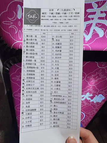 木耳 / 水蓮 / 四季豆 / 玉米 / 玉米筍 / 杏鮑菇 / 招牌豆皮 / 花椰菜 / 紅花麻辣鹽水雞 / 紅花鹹水雞 / 苦瓜 / 香菇 / 高麗菜 / 甜不辣 / 鳥蛋 / 煙燻雞胸 / 豬血糕 / 龍鬚菜 / 鹽水雞腿 / 豆干 / 豆皮 / 海帶 / 煙燻鹽水雞 / 雞肝 / 鹽水雞