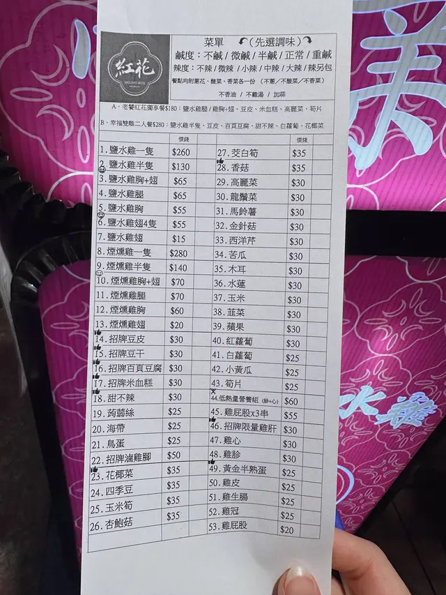 紅花麻辣鹽水雞|通化/臨江街夜市宵夜美食,在地飄香30年!不排隊吃不到的超人氣煙燻鹽水雞。菜單價位( 羽諾等級72021-10-0230 瀏覽 關注 通化夜市超人氣熱門美食推薦! 大安區必吃美食「紅花麻辣鹽水雞」煙燻雞、百頁豆腐、雞胸...等等都是店內的超人氣美食想來大安區吃晚餐、宵夜、鹽水雞等等這間位於通化夜市內營業到凌晨十二點的「紅花麻辣鹽水雞」也是不錯的選擇台北大安區好吃宵夜、鹹水雞、捷運信義安和站宵夜美食、夜市小吃美食信義安和站必吃推薦、鹹水雞、煙燻雞、超人氣美食、紅花麻辣鹽水雞 紅花麻辣鹽水雞 提到通化夜市 就不得不提到這間飄香27年的紅花麻辣鹽水雞從夜市路口就可以發現長長的隊伍想略過這間必吃美食都很難想試試通化/臨江夜市的其他美食也可以參考"台北通化街/臨江觀光夜市必吃美食攻略懶人包"無論是米其林必比登推介小吃、宵夜或是平價美食在懶人包裡都有 「紅花麻辣鹽水雞」菜單價格 以大台北來說價格還可以接受範圍 畢竟好吃比較重要而且新鮮度跟其他家比起來是真的有落差的 「紅花麻辣鹽水雞」可以選的菜色超多種 除了雞肉好吃外 許多小菜也很好吃無論是苦瓜 杏鮑菇 花椰菜...等等 幾乎是每次過來都必點 以前只有一個攤位現在生意已經好到需要區分挑選食材區及去骨切盤區兩攤位才能消化人潮鹽水雞每次都點煙燻的又香又嫩鹹度也夠 重點是口感不柴 很好吃 杏鮑菇 小黃瓜 苦瓜 豆干的表現也現優秀 由於生意很好 因此食材都可以維持得很新鮮 這點也是一大優點 總之過來通化夜市時 如果沒有排太多人 都會來買一下紅花麻辣鹽水雞的餐點好吃 價格合理 經過附近時不妨也來嘗嘗看吧!!…查看更多+ 6以上食記乃用戶個人意見,並不代表OpenRice之觀點。讚好分享紅花麻辣鹽水雞|通化/臨江街夜市宵夜美食,在地飄香30年!不排隊吃不到的超人氣煙燻鹽水雞。菜單價位( 紅花麻辣鹽水雞 https://s.openrice.com/cHRTm02POC200檢舉 張貼 評分4味道3環境3服務3衛生4CP值用餐方式外帶同步刊登https://v84454058.pixnet.net/blog/post/...