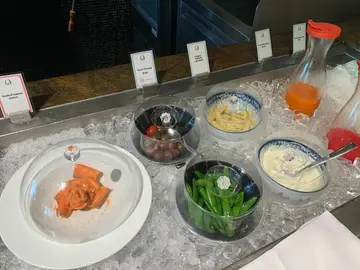 雖然很常到美麗華附近不過很少到維多麗亞酒店這次經過推薦到了酒店內的la FESTA義大利餐廳用餐la FESTA是維多麗亞酒店和義大利米其林一星餐廳 La Credenza 合作推出的新品牌一進餐廳門口一邊就是酒吧櫃檯區另一邊是滿滿的紅酒展示櫃雖然是假日中午不過客人數大概3.4成環境很舒服安靜座位和座位之間都有適當的間距餐廳最內部是半開放式的廚房可以看到多達6.7個廚師在忙碌中窗邊座位可以看到大直區的一片綠地和新建築沙發椅很貼心旁邊有個掛勾的設計可以掛包包這幅畫是天花板的壁畫不小心抬頭看到才發現的餐廳小巧思中午有午間套餐平假日都有算是比較經濟的選擇水資要80元可以選擇氣泡水或礦泉水午間套餐包含開胃菜.湯或沙拉.甜點和飲料菜色名稱都很長.....看了都讓人很感興趣主餐類有義大利麵.燉飯還有排餐價位從800元起跳這天因為沒有很餓所以點了洋芋餃...甜點的選擇也不少餐前麵包有杏仁麵包和奶油麵包有附橄欖油醋醬和鯷魚醬鯷魚醬味道滿鮮香的杏仁麵包味道不太突出白色的麵包比較有點嚼勁 也比較香香煎北海道生食干貝佐奶油南瓜醬汁.清炒菠菜好漂亮的擺盤!!黃色的底醬是奶油南瓜醬汁南瓜味很香濃 感覺好像是濃稠些的南瓜濃湯下面有舖一些菠菜干貝外層略微煎過有一些焦香感裡層則是是略生滑嫩的口感(沒有熟干貝的絲絲口感)搭配南瓜醬汁一起吃味道更具層次野菇濃湯佐手工義式雞肉餃野菇濃湯的的菇味超級香濃!!蒜苗洋芋濃湯佐小牛肉球又是一漂亮擺盤力作中間是蒜苗洋芋 雖是蒜苗但是味道不會太重或嗆蔬菜濃湯也有濃濃的蔬菜香味道上都是很實在的小牛肉球應該是稍微煎過小小的牛肉球也充滿彈性番茄水牛起士沙拉煙燻洋芋餃佐有機豌豆醬汁.季節蔬菜.帕瑪火腿底部的醬汁跟之前喝到的湯品看起來很像不過味道略微不同是淡淡的豌豆味餃子裡面包的是有煙燻味的洋芋泥外面有不少的胡蘿蔔和火腿 (事實上光吃外面的配料 感覺好像在吃炒蔬菜)主菜點這道感覺好像還是薄弱了些還是應該點排餐吧~起士南瓜餃佐羅勒醬餃子裡面包的 就是很扎實的起士入味的南瓜泥培根乳酪義大利麵這道義大利麵的配料是很入味香鹹的培根還有超濃稠的起士味整體口味很重 也容易膩喔!飲料部分點了柳橙汁是當天中央廚房統一現榨的味道頗新鮮也好酸熱洋甘菊茶套餐只有一杯...我覺得非常虛!手工義式杏仁冰淇淋.牛奶奶泡..底層還有草莓和巧克力海綿蛋糕甜點-杏仁冰淇淋的杏仁味很濃很香右邊的奶油狀是牛奶奶泡 也很香甜杏仁冰淇淋搭配牛奶奶泡 甜香而不膩 又有杏仁的香氣 很不錯吃!底部還有巧克力海綿蛋糕跟一點草莓可以搭配甜點-蛋糕佐糖漬大黃.法芙娜巧克力橄欖油慕斯甜點-法芙娜巧克力慕斯吃完la FESTA的午間套餐菜色上覺得頗有創意但是味道上就比較沒有特別驚艷之處不過到了3點過後餐廳內客人變很多 原來大家都來享用這邊的下午茶饗宴了~查看更多