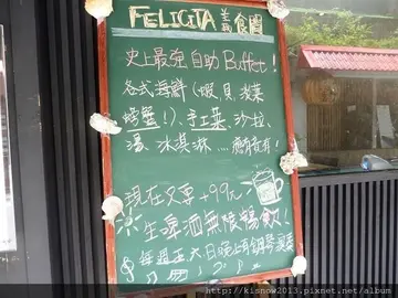 這次体驗地點是"FELICITA義食間-復北店",FELICITA義大利文是幸福之意,希望來這家店用餐的客人,可以感受到店家用心製作的餐點和服務,用餐完畢後帶著幸福笑容離開,原本這家餐廳提供各式義式料理,甜點,飲品等,從今年6月開始改變型態,提供自助式Buffet吃到飽餐點,每日午餐和晚餐營業時段成人約380元,兒童約190元,用餐時間為1.5小時,並加收10%服務費,台北吃到飽餐廳眾多,現在又多了一家餐廳可以選擇.        FELICITA義食間-復北店位於台北市松山區,靠近台北捷運中山國中站附近,這裡位居巷弄內,但附近的美食餐廳相當多,FELICITA義食間-復北店的門口有一個小庭院,走進店內發現這裡環境寬大舒適,桌椅擺設整齊乾淨,每張桌椅位置之間不會感到擁擠,整体佈置是簡約風格,沒有多餘裝飾,只有一架鋼琴作陪襯,其實每週五,六,日的晚上這裡會有鋼琴演奏.雖然是吃到飽型態的餐廳,這家店還是有設WIFI無線網路,供用餐顧客使用.在接近Buffet區的前面設有碗盤區,可以自行取用餐盤,湯碗,紙巾和餐具.      這裡的自助式Buffet區菜色多樣,看起來相當琳琅滿目,而且擺盤頗有巧思和創意,包括:異國料理,冷盤,海鮮類,熱食,炒飯,麵包,湯類,水果,生菜沙拉等,這些餐點食物擺設整齊,有些食品也有標示名稱,想吃什麼食物或餐點都可以自由取用.    這裡也有供應飲料,在前面吧台區有供應紅茶,果汁和白開水,可以自行取用,除了前述的冷飲,還有供應可樂,雪碧汽水,以及冷,熱咖啡,這些都必須請服務人員幫忙才能取用,在這裡只要再加99元就能無限暢飲生啤酒.(未成年請勿飲酒,開車不喝酒,喝酒不開車)  我是冰淇淋控,當然不能錯過這裡的冰淇淋,冰淇淋是客惟您低脂冰淇淋,共有四種口味選擇,餐後記得用冰淇淋畫下甜美的句點.一.淡菜+泰式風味涼拌花枝+燻鮭魚洋葱沙拉:    燻鮭魚洋葱沙拉其中的燻鮭魚呈現粉紅色,它在口感上煙燻味不重,而且鹹度適宜,新鮮的洋葱絲搭配義式油醋醬汁和香料,吃起來是清脆鮮甜的口感,為燻鮭魚增添清爽辛香的滋味.  淡菜的肉質雖小,但吃起來的口感飽滿新鮮.  涼拌花枝具有泰式風味,花枝切成長條狀,並且刻花,吃起來是酸辣的滋味,花枝肉質新鮮,具有彈性.雖然味道酸辣,但不會太過強烈,反而在小黃瓜搭配下,呈現新鮮清爽的味道. 二.蘭花蟹+秋刀魚+蒜味蛤蜊+豬腱肉:    蘭花蟹外表紅色帶有少許花紋,它的肉質不多,吃起來是新鮮多汁的口感.  豬腱肉是豬肉的精華部位,通常在豬的前腿或後腿部位,它的肉質切成薄片狀,略呈現粉嫩色澤,它不肥,也不油膩,吃起來的質感柔軟,帶有一些韌勁,在口中咀嚼會散發鮮美的滋味.  蒜味蛤蜊經過醃漬,肉質呈現暗褐色,而且飽滿完整,吃起來具有甜度,帶有微苦的滋味,但仔細咀嚼還是覺得味道可口;秋刀魚切成長塊狀,因為用日式作法,吃起來不但具有甜度,肉質也變得柔軟,類似蒲燒鰻魚的口感. 三.魔鬼蛋+炒飯+龍鬚菜+炸銀魚:  龍鬚菜外表翠綠色,經過熱炒方式,吃起來是清脆的口感,略帶有蒜香的滋味.  炒飯的口感清淡不油膩,而且帶有一點甜度,飯粒分明而且柔軟,吃起來不會覺得太乾燥或油膩,反而呈現清爽的風味.魔鬼蛋是白煮蛋的創意吃法,這裡的魔鬼蛋有兩種,其中之一的魔鬼蛋顏色較深,還搭配偏硬的筆管麵作點綴,蛋的部份似乎經過醃漬,吃起來是微酸帶鹹的口感;另一款魔鬼蛋味道比較自然,以白煮蛋為基礎,蛋黃部份有稍作處理,吃起來是蛋沙拉的滋味,口感比較濃郁,蛋白的滋味軟嫩帶有一點彈性. 四.新鮮白蝦+南瓜濃湯+烤麵包:  白蝦外表淡紅色,整体体型雖小,但都保持完整,肉質粉嫩看起來蠻纖細,吃起來是新鮮的口感,肉質具有彈性,咀嚼起來是相當可口的滋味.    這家餐廳的Buffet也有供應麵包,麵包切成吐司形狀,現場有巧克力,花生醬,草莓果醬,奶油四種醬料供選擇,並且有烤箱可以烘烤.烘烤時間不宜過長,否則容易焦掉,烤過的麵包塗上醬料,吃起來是相當柔軟的滋味,外層還帶有一點焦香的脆度.  這家店的Buffet也有供應湯類,這次是体驗南瓜濃湯,它的湯汁呈現金黃色,喝起來是清淡的甜度,並具有濃郁的滋味. 五.綜合炸物+咖啡+冰淇淋+百香果蒟篛+水果:  百香果蒟篛放在麵包區旁邊,很多人以為是愛玉,其實是百香果蒟篛,它的湯汁和果凍都呈現金黃色,並且浮現百香果黑籽,百香果蒟篛質感柔軟,帶有一點Q嫩的彈性,具有百香果香氣和滋味,吃起來是酸甜清涼的口感.綜合炸物包括雞肉塊,雞米花和炸薯條,外表呈現金黃色,最好趁熱食用,口感比較可口.  冰淇淋是客惟您的低脂冰淇淋,共有四種口味,薄荷巧克力冰淇淋是淺綠色,帶有一點巧克力的碎粒,它的口感香甜清涼;草莓冰淇淋外表粉紅色,口感香甜濃郁,芋頭冰淇淋外表淡紫色,吃起來是也是濃郁香甜的滋味,並且帶有少許芋頭顆粒.餐後最好用水果幫助消化,我這次只有選擇芭樂,鳳梨和葡萄,鳳梨口感微酸香甜,葡萄和芭樂也都是新鮮的質感,葡萄味道和鳳梨相似,也是微酸香甜的滋味,芭樂切片比較厚實,吃起來是清脆紮實的口感.這家自助式Buffet有供應冰咖啡和熱咖啡,但都必須透過服務人員幫忙才能取用,我這次是体驗熱咖啡,它是研磨咖啡,喝起來具有濃純的香氣和味道,想要加糖和奶精,也必須向服務人員取用.  FELICITA義食間-復北店的自助Buffet區的種類包括:生菜沙拉,異國沙拉,異國料理,海鮮,冷盤,熱食,炸物,水果,麵包,甜點和飲料等.其中海