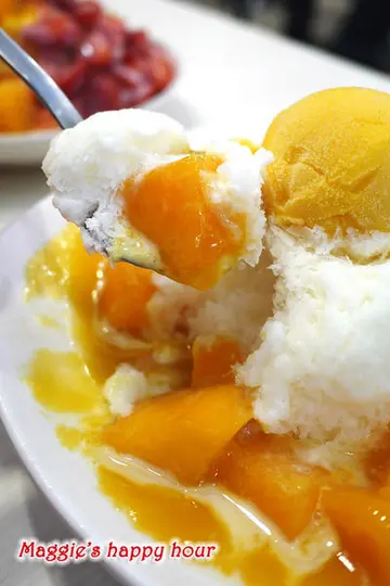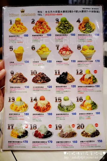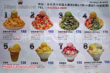 哇哇哇!這幾天的高溫動輒到38度,瑪姬就算在家裡坐著不動都感受到那熱力了,這時候除了在有冷氣的地方待著最好外,就是旁邊就有一碗沁涼的冰品最消暑啦!永康街的芒果冰舉世聞名,觀光客必朝聖的美食點,這裡可是冰品的一級戰區,今天就來其中的一家【芒果皇帝】吃冰,我也要冰涼暢快啦!芒果皇帝店址就在永康街2巷2-1號,其實不在巷子裡就在永康街上,黃色的明顯招牌很顯眼,正是芒果的顏色。 店門口有清楚的冰品項目,圖文並茂讓人一目瞭然。底下那隻廚師裝扮的台灣黑熊模樣真是可愛。 想吃什麼就在門口的點餐枱上點好,入內等待叫號取冰即可,仔細一看所有的冰品都有中、英、日文的介紹,因為觀光客都知道要吃芒果冰就來永康街啊! 櫃台上就放了一盤新鮮芒果來吸客。室內的環境採開放式,以潔白的米色系讓人感到舒適,大大的芒果皇帝店名就在店內最顯眼的位置。 菜單封面滿滿的水果讓人食指大動。 翻開背面就是冰品介紹,裡面的種類多達20種,除了水果為主外還有好吃的芋頭和大豆,都是我愛吃的啊! 「新鮮綜合水果牛奶冰」這盤以三種新鮮的芒果、奇異果和草莓成為一個金三角,最頂端搭配一顆香濃的芒果雪酪。芒果皇帝店內全面使用品質最頂級的愛文芒果,皆由固定合作產地直接配送,使用能夠獲得在樹上多停留2至3天、也就是俗稱的 “在欉紅”等級除此之外,冬季則選擇來自大湖的草莓、紐西蘭進口的奇異果和愛文芒果做搭配,另外自製「雪酪」,取代一般冰淇淋、100%以水果為食材製成,無添加鮮奶或奶油,不含乳脂且熱量極低,口感相當清爽。這盤金三角水果牛奶冰的紅、綠、黃配色鮮明,我覺得光視覺上先享受這一味就好滿足,連隔壁桌的日本美眉觀光客看到這盤綜合水果牛奶冰上桌,立馬請求給她們拍張照留念,能為自家觀光帶來良好的宣傳當然很樂意出借拍照,這就是我之前說過賣相好自然能吸引人的道理,尤其是對自由行的各國觀光客來說更是有加分效果。 裡面的愛文芒果味道很香,果肉滑順又紮實,真是好吃,今天夏天吃了不少芒果冰,還是讓人難以抗拒這般美味。 雖然是夏天但有草莓的出現讓我意外,我想要維持一整年都有草莓可能要靠科技冷卻技術的幫忙才有辦法吃得到。草莓雖然沒有冬天當季來得甜,但果肉仍然新鮮有彈性,搭配上牛奶冰裡店家特調的糖水和果蜜,一口吃下甜度剛好,而且草莓依然散發出淡淡香氣,是女生最喜歡的味道。 最頂端的芒果雪酪和冰淇淋不同的地方在於口感綿密而有彈性,而且不會快速融化,就算我們花了點時間拍照後再吃依然屹立不搖,最可喜的是它的熱量低,這點對於怕影響身材的美眉來說是一大福音。牛奶冰就是以「剉冰」為基底在淋上糖水,吃起來沙沙的口感很清涼消暑。「新鮮芒果雪花冰」雪白的雪花冰外圍著黃澄澄的芒果果肉和頂端的芒果雪酪,在夏天裡看到這樣的東西都清涼了起來。和牛奶冰的不同在於這雪花冰是以牛奶為基底下去刨成細綿的雪花冰,吃起來有牛奶的香濃口味,和冰體的綿密口感,而且它的特性是不會快速融化,這更可以讓我們不用急迫的吃完它,更可以跟朋友邊吃邊聊,慢慢享受眼前的可口冰品。 看看這細緻的雪花冰,是不是都清涼了起來,足以抵抗外頭的炎炎烈日啊! 芒果皇帝用嚴選食材搭配多樣化的種類來維持店內的一貫品質,以永康街這觀光客必來的地區來說佔有一席之地不是沒有道理的,來到這裡別忘了進來嚐嚐這一味哦!…查看更多