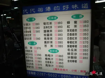茗陽甘蔗牛奶大王,我是來買這個的。忠孝夜市這邊一樣也是不知道啥好吃,隔壁的味泉米糕蠻有名,尚未一嚐,來到茗陽的攤子前,跟看起來默默的老闆點了一杯甘蔗牛奶和菊花茶。我對飲料的靈敏度不高,大概都要有一定水準的好或是差,才會有感覺,這次買了倒是覺得兩種都挺好喝,他家還有賣一瓶80元的比較多,飲料控可以喝爽爽吧~