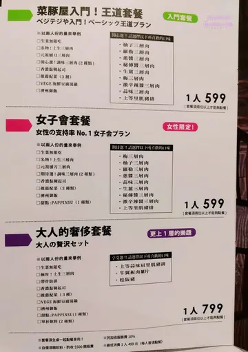 之前來精誠五街吃早午餐就有注意到這家VEGE TEJI YA 菜豚屋很有趣的是日本人開的韓式烤肉店 結合韓國的傳統美味跟日式的創意吃法 而且提供桌邊料理服務。店內風格又帶了點美式風 店員介紹時我們都覺得也太多元化XD不是韓國料理店 是日本style的生菜包肉多種新鮮蔬菜包肉組合,讓吃肉有更多創意吃跟變化台灣只有菜豚屋才有的無農藥有機生菜 從日本帶過來的品種吃起來柔嫩沒有很青的菜味 連男生都覺得這個菜好不過因為季節因素 供應量有限 會提供別種生菜搭配嚴選台灣菜農有機種植,在台灣的新北市雙溪、南投、高雄鳳山建立「自社農園VEGETEJI FARM」,每天新鮮現摘清洗讓顧客吃得安心放心還有提供豆芽菜 泡菜 小黃瓜 墨西哥餅皮 涼拌柴魚洋蔥 讓顧客自己搭配菜單點我這次吃的是菜豚屋入門!王道套餐 內容 數量 名物!上生三層肉 各1份 元祖刨刀三層肉 香濃黏稠起司 濟州御飯 VEGE海鮮豆腐湯鍋 配菜(依當日現場提供為主,恕不得指定) 3種 開心選!調味三層肉※上等里肌豬排 / 梅三層肉 / 激辛辣醬三層肉 / 蒜味三層肉 / 生薑三層肉 / 蔥醬三層肉 / 秘傳醬三層肉 / 柚子三層肉 / 羅勒三層肉 (任選2種,不得重複) ※ 1份 生菜、蔥、沙拉 無限供應 名物!上生三層肉其實我有時候吃外面的三層肉會怕怕的 不過這次吃菜豚屋的覺得他們的三層肉好吃耶!特選頂級自然豬肉,吃起來沒有騷味當店員將三層肉放到烤盤上 聽到滋滋作響聲 接著聞到香氣 口水都要留下來沾建議先吃原味 生菜每片差不多都手掌大很方便拿取跟包肉~也有提供不同沾醬 韓式味噌 椒鹽香油 醬油超邪惡的起司加熱後沾肉那牽絲太犯規了!!!沾了起司後 香濃可口 包入墨西哥餅皮裡 再加入小黃瓜 泡菜口感、滋味層次更升級!元祖刨刀三層肉這款吃起來入口即化 帶點焦香 也好吃而且生菜吃到飽 搭配生菜吃大大減低油膩感 可以吃更多肉 秘傳醬三層肉 / 柚子三層肉這兩種調味都大推!!! 以後來還是會選它們!!!秘傳醬非常夠味 鹹香十足還帶甜味 不用沾醬會很想配飯XDDD 覺得這醬實在太好吃!柚子醬女生絕對會喜歡! 吃起來甜中帶酸帶清新的柚子香氣 讓人忍不住一塊接一塊~只能說他們的三層肉好強大 單吃其實就不膩加上生菜 小菜的加持,吃到飽的不要不要的 卻不膩口VEGE海鮮豆腐湯鍋光吃肉就飽了 還有一鍋滿滿都是料的海鮮豆腐鍋 濟州御飯最後壓垮我們的就是這店員現炒現做的鐵板拌飯還很可愛的用成豬的造型最愛那個鍋巴 炒飯吃起來香氣十足 加了海苔跟蔥花更香【後記】:主打有機健康的生菜包肉吃起來比一般燒肉店更多變化, 這次吃完覺得有好吃喜歡會再訪的店~推薦給大家…查看更多