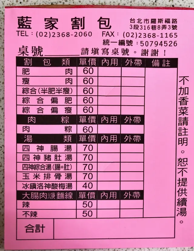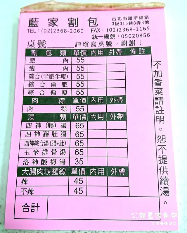 連續多年米其林必比登推薦台大公館夜市小吃美食《藍家割包》,可以說是台北割包與台大公館美食代表之一,之前經過《藍家割包》都會看到排隊的人潮,現在割包一個漲到70元,很多人都說貴且味道不如從前,可是還是許多人會去吃,重點是《藍家割包》除了割包可以客製化之外,其實隱藏版玉米排骨湯才是本體啦!現在網路上已經有超過6000則評論了。|必比登推薦台大公館夜市美食藍家割包台大公館必吃的小吃美食之一《藍家割包》,確切位置是在羅斯福路三段316巷轉進來這邊,如果是住在永和一帶應該不陌生,從永福橋下來都會走到這條巷子,從捷運公館站4號出口出來走到《藍家割包》,大約兩分鐘的步行距離,附近比較不好停車,可能要停到汀州路上面的停車場,與對面陳三鼎青蛙撞奶是以前台大公館美食的兩大門神,現在就只剩下《藍家割包》,旁邊金雞園也是老店,口味還不錯。《藍家割包》的主要作業區域是在外面,所以在店門口就能看到工作人員在包割包,大部份來《藍家割包》都是外帶為主,所以看到有排隊的都是外帶的,內用大多時間是沒有排隊,還蠻少去內用,所以大多都是直接走進去比較多,《藍家割包》內用環境就蠻一般傳統的小吃店,牆上放一些放泛黃的報導,但老實說有米其林必比登推薦了,比那些報導更有效一些。|藍家割包菜單價格藍家割包菜單有被人說過大概一陣子來又會漲價了,老實說現在幾乎都是萬物齊漲,上次看到一家麵店漲2元也被抱怨,還不如漲到開心就好,真的喜歡的還是會去啦!最有名的割包現在是賣65元,湯的部份是賣80元,目前所有品項都漲5元了,建議一定要點玉米排骨湯,其實這才是藍家割包最強的,真的超好喝的。|藍家割包推薦必點排骨玉米湯割包(綜合) NT$70元割包吃到後來,比較能確定的是我喜歡那種直球對決的割包,就是裡面直接放一整塊焢肉,吃起來還蠻爽的,大概就三重無名割包與源芳這種很愛,一甲子則是花生粉放太多,《藍家割包》算是比較不一樣的做法,是放碎肉進去的,但也是這一派流的頂了啊!做到非常客製化,你要肥的還是要瘦的,或者是偏肥一點偏瘦一些都可以,還可以註記花生粉要少一些或酸菜要少一些,通常都會點綜合就是肥瘦平均。《藍家割包》內餡的焢肉滷得都很夠味,再加上花生粉跟酸菜味道也很剛好,不會太搶,讓整個吃起來很均衡,不會覺得太乾也不會覺得太油,割包外層皮吃起來也很軟,這也是它們最厲害的,不會太溼掉,大概僅次於源芳的皮,雖然不是那種很直球的割包,但吃起來也真的很不賴。四神綜合湯 NT$80元四神湯要賣到80元,老實說沒有幾家店這樣子賣,只是裡面的大腸跟肚子算是給的很豐富,有對得起其價格,喝起來湯底是很溫醇的,很順很甘甜,腸子跟豬肚也是相當的乾淨,沒有其他腥味,口感也不會太韌,算是中上等級的四神湯,原則上真的是可以點的。玉米排骨湯 NT$85元但是《藍家割包》最強的應該是這個玉米排骨湯,真的是一喝就上癮,首先第一口就能喝得出玉米的香甜,湯頭真的是甜到不行,那個甜味就是那種湯頭燉很久的感覺,還帶有一點豚骨的鹹香,超好喝的,玉米本身吃起來也很甜,排骨也是燉到肉質很軟爛,吃起來口感也是相當好,這個湯單獨出來賣也是很可以啊!《藍家割包》真的是講到台大公館美食,幾乎都會有人推薦的,也是真的賣得超久的一家店,然後也是價格一直被大家討論的一家店,先不以價格來看待,以《藍家割包》這樣客製化的割包,老實說處理得還不錯,然後湯真的也行,但是一餐要一個割包配一碗湯,真的會覺得有點貴,只能跟自己說,加油!再多賺一點錢吧!藍家割包…查看更多