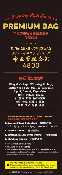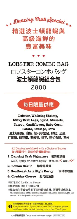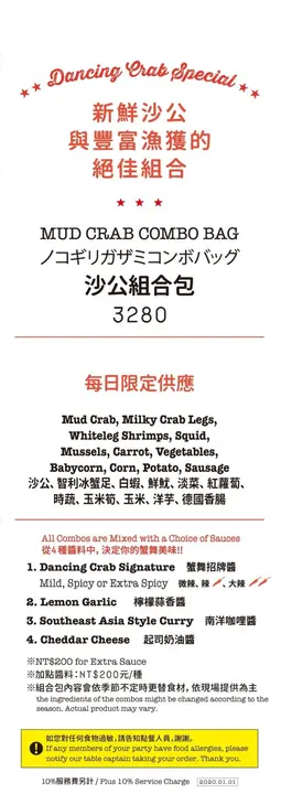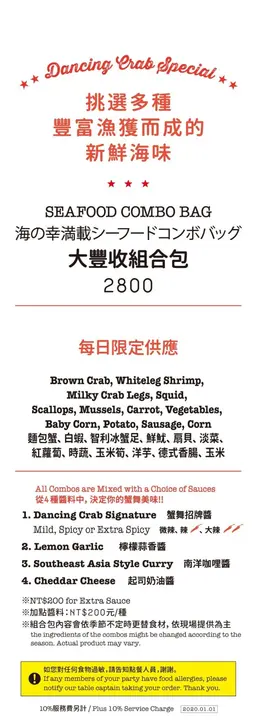 如果要特別選出吃到就是賺到,台北頂級商業午餐名單的話,DANCING CRAB蟹舞絕對是榜中有名。聽到室友說微風南山這間手抓海鮮的商業午餐非常便宜,鑒於我去西雅圖竟然錯過海鮮,加上想找個名堂告別2019年,於是在跨年當天中午我們就來微風南山報到了讓我先來介紹一下Dancing crab的菜單選擇,依照雙人和多人組合各有推薦的套餐首先!倘若你是第一次來 或是 雙人來用餐,那就是毫不猶豫選擇下面這張1人份的480元和560元差別在於螃蟹,就直接560元點下去!沙拉、濃湯(超好喝)、義大利麵和麵包無限續服務生幫我們點完餐後,會遞給我們螃蟹髮箍和圍兜兜,最後幫我們鋪上餐巾紙,等等所有食材都是倒在餐巾紙上頭,也提醒我們可以到後方先洗手Dancing Crab服務生除了特別熱情,還注意到當天我的咳嗽,詢問我需不需要溫開水(大心)也可以加購1杯NT.20 擁有軟性飲料好的,沙拉先來了,是我最喜歡的凱薩沙拉,服務生還幽默地說,別看我們家沙拉長得不好看,但很好吃喔!服務生語畢遂即撒上起司,還應我們要求多撒許多和momo壽喜燒一樣會有餐車不斷在席間移動,為大家添補義大利麵、麵包和時蔬沙拉要來非常認真認真推薦Dancing crab的蛤蠣濃湯,完全和我在西雅圖喝到的濃湯一模一樣,充滿海鮮鮮甜的鹹味,我們都想衝進廚房看看煮濃湯的鍋子是不是滿滿的蛤蠣,儘管在dancing crab的蛤蠣濃湯只是小配角,但絕對有進入台北前三好喝的濃湯,可以續碗,請大家盡情喝很快的,我們的手抓海鮮組合包來了~~~~~在倒入手抓海鮮過程中,服務生會帶領你們喊歡呼口號,細節我就不在這邊多說了,讓你們親自來體驗~午餐的手抓海鮮可以醬料四選二,我們嘗試了蟹舞招牌醬和檸檬蒜香醬,蟹舞醬是用番茄、洋蔥為基底加入肯瓊辛香料,並用魚露與泰國辣醬提味,熬煮兩個半小時而成,我個人比較愛蟹舞醬,吃起來濃郁不膩口,下次來還要繼續選它附著蟹剪讓我們方便為螃蟹去殼,這邊就是我心有戚戚焉的地方,螃蟹真的好吃太多太多太多,淡菜和玉米也很不錯喔!既然是手抓海鮮,就難免會吃的比較狼狽些,請大家放下矜持,大方的用手抓取食物享用吧!我們一致認為560元的個人套餐組合最為剛好,兩個人來剛好可以互點各一醬料來交換吃平均每15分鐘就有服務生的熱歌勁舞,看得出來服務生都很熱衷於工作,也很熱情自然的推薦店內特色給客人知曉整體來說,是一間我會在特殊節日或朋友慶生會選擇的餐廳,特別是平日商午套餐非常划算…查看更多