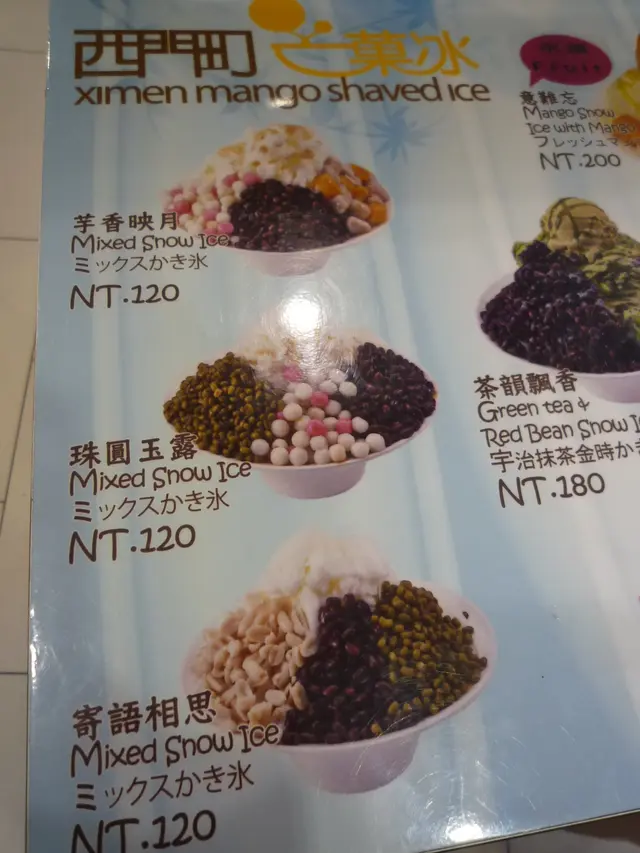 西門町 芒菓冰 土芒果冰 dressingfrad等級42014-01-0937 瀏覽 關注 是說現在西門町好...國際化喔 迎面走來聽到的都不是中文還有導遊帶著團體客對著苦瓜照相是哪招一邊要小心被川流不息的行李箱撞到終於到了目的地 西門町芒菓冰周一~周四好像有優惠活動 旗子拍反了可以單點冰淇淋 一球40還沒進店裡就有菜單有金芒果!!好金好大顆!!一樓空間不大但是椅子色彩很繽紛這裡採櫃檯先點餐路線所以來看菜單啦有傳統四果冰路線 1204~6月季節限定款 多了土芒果的意難忘今天的目標 茶韻飄香還有芒果 榴槤 草莓 以及綜合水果冰身為芒果冰 也有賣芒果汁還有苦瓜汁...好健康鬆餅名稱也好有趣 是說菜單都有中英文版本而且看一下都沒有亂翻譯 還不錯看網友去的經驗 店員會希望你坐一樓果然是這樣耶 到底跟二樓差在哪上去瞧瞧一上樓側邊就有座位樓上很寬敞可以一大群人來這嗑冰這是一顆大~~芒果窗戶 好可愛終於找到傳說中的芒果樹了~~在外面露臺上還有標示咧 怎麼這麼貼心拍完下樓 芒果冰也來啦愛相隨芒菓冰 180首先先說芒果好了 我覺得很不錯就是我自己去買愛文芒果如果選到這顆我會覺得有選對的那種甜度永康街某新開的店舖的芒果一點都不優這家就讓我對芒果冰恢復了信心雪花冰本人也是土芒果製成的芒果冰磚下去所以每一口都很有味道芒果冰淇淋裡面竟然吃的到芒果(乾)這點還滿有趣的 也是一個濃郁好像還有點優格的路線 跟雪花搭起來 意外的清爽看網路美美的照片 等很久的茶韻飄香 180想說~~怎麼比網路照片好像小了點換個角度看看先從紅豆開始吃煮的不會過爛 紅豆殼還保留 但是也不會硬單吃不會過甜雪花冰很抹茶~~這點有紮實 吃的出真的是抹茶而不是淋醬或是色素吃到抹茶和紅豆的經典組合 默默的覺得不錯本日最驚喜 朋友先吃了一口抹茶冰淇淋抬頭跟我說 這好吃!!不單單只是抹茶的味道感覺更深一層的 感覺有不同茶味的組合這要來研究一下有沒有單點 一球40的話太便宜了現在抹茶正夯 ~~雖然盤上體積看起來沒有想像中的大但是盤子凹槽還滿深的所以吃到最後一人一盤還真有點吃不完 很飽…查看更多+ 21以上食記乃用戶個人意見,並不代表OpenRice之觀點。讚好分享西門町 芒菓冰 土芒果冰 西門町芒菓冰 https://s.openrice.com/cHRTm02N0q000檢舉 張貼 評分3味道4環境3服務3衛生2CP值推薦菜愛相隨芒菓冰 180茶韻飄香 180用餐日期2013-07-24用餐方式內用人均消費NT$180