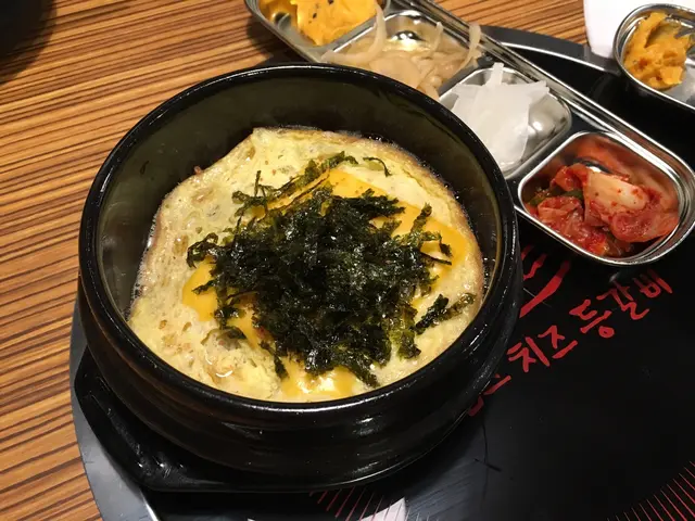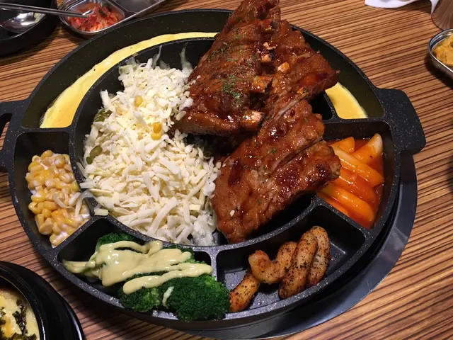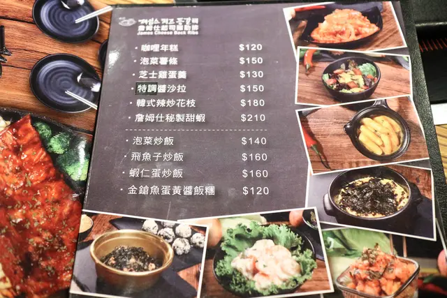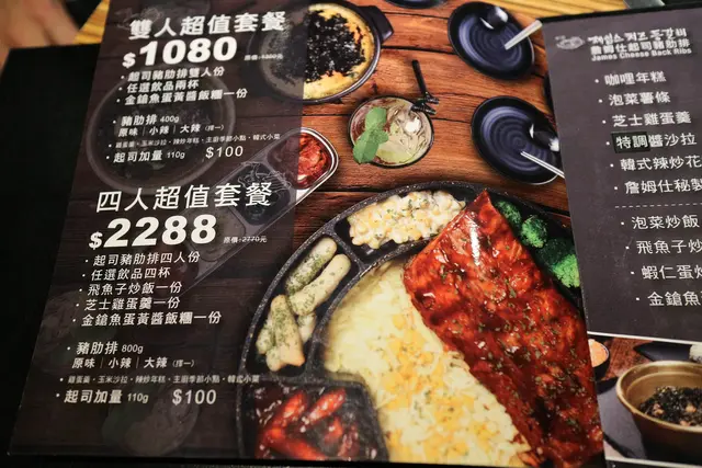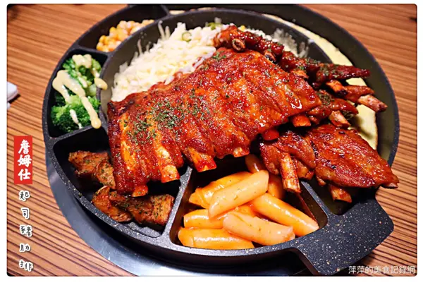 (忠孝敦化站)詹姆仕起司豬肋排台灣總店/邪惡的起司肋排不用去韓國也吃得到之前跟家人去釜山遊玩時!特地安排要吃詹姆仕起司豬肋排這邪惡的小玩意但卻連找了二次也找不到店家!!!!怒怒怒沒有吃到就回台灣了!現在台灣首家分店在台北東區開立了!我無法瘋狂地去排隊只好乖乖等著熱潮沒有那麼高再來晚餐預約時間分為二個時間點:晚上6點與7點半,用餐時間分別限制一個半小時店內還滿大的滿有聖誕氣氛的 ~已入內已經不少小少女們在內聚餐約會放眼望去好想是我們這一桌平均年齡最大XD店內的菜色提供的種類其實還滿簡單的主打就是詹姆士起司豬肋排每人消費低銷就是一杯飲料就算點了不少餐點!沒有點飲料或是酒品通通未達低銷標準喔套餐分為單人套餐/雙人套餐/四人套餐像我們今天共三人來用餐!店家也可以調配成三人套餐的份量主要看客人需求不過我們想要多吃幾款餐點,所以以雙人套餐再加點其他餐點平均下來一個人花費大約500元(不過這樣的份量對大多數人來應該有點不太飽)要吃飽一下可能預算要再高一點桌面不大!所有的餐具(筷子/湯匙)餐巾紙都是擺放在抽屜中因為鐵盤個頭不小!只要鐵盤一送上桌!桌子就會呈現很滿的狀態XD四道小菜 口味都還滿不錯的可再續點分別是南瓜泥/醃洋蔥/黃豆芽/醃蘿蔔金槍魚蛋黃醬飯糰一份沒錯!這是飯糰~需要自己動手Diy的飯糰兒當然就交給我的副手 來處理了自己動手捏出大小自己喜歡的大小那一小鍋的份量大約就是這樣小球的三倍份量米飯熱熱的吃起來還滿軟Q的.所謂金槍魚的味道吃起來還滿類似鮪魚罐頭的味道就是魚味偏向比較重的味道加入了蛋黃醬吃起來但點甜度很快的本日主餐重頭戲上桌了特製的鐵盤!下頭有個電磁爐所以會持續加熱這樣起司絲才會融化成邪惡的模樣XD除了起司/烤肋排之外一旁還有附上花椰菜/甜不辣/玉米粒/烤蛋/年糕等等配菜配菜口味尚可~對了~肋排有分辣度基本上原味就帶有一點小辣的程度對於吃辣很不行的我們直接點了原味由專業的神之手先幫我們將肋排剪成一段一段的此刻起司也融化的差不多了~小少女們放聲尖叫了至少可以拉到40-50公分長的起司差一點有一股衝動想站在椅子上拉看看他最長可以拉到多遠XDDD雙人份的烤肋排大約是7根左右裹起司要裹得漂亮可是需要受過訓練的喔~服務人員會幫客人先裹好一人一根的肋排接下來就是客人可以自己動手DIY~果然有沒有訓練過差很多我的就裹得亂七八糟完美的起司一層一層的包覆在烤肋排上直接套上塑膠手套就可以豪邁大吃了烤肋排很入味!單吃沒有起司的部分醬料甜甜鹹鹹的比起一般美式餐廳吃到的烤肋排調味比較沒那麼重而且肉還滿軟嫩的 !不太需要費牙口來咬XD氣泡式飲料顏色還滿繽紛的但喝起來的口味就是汽水XD加點飛魚子炒飯利用已經清空的鐵盤中心拌炒其實份量也不算太多啦~不過味道算是好的大部分的餐點都會有服務人員協助調理客人只要坐著乖乖等吃就好餐點表現還不錯!只不過單價算是有點小高服務也滿好的~交通也滿方便的希望將來可以有更多樣化的餐點提供選擇…查看更多