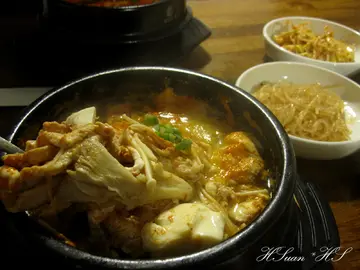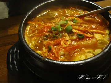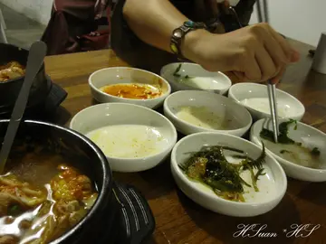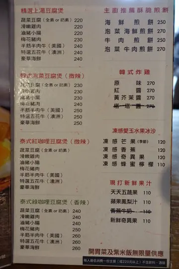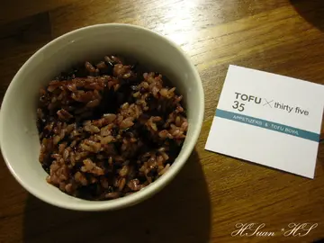 不久前搜尋到這家算是剛開不久的店,位於勤美成品綠園道附近,少見的韓式豆腐煲馬上動搖我的味蕾,打算找個時間嚐嚐!今天為了慶祝生日,在大家表決一致通過下,選擇了 豆腐35。訂了18:00的位置,剛到時人還不多,我們是第二桌客人。(沒想到越晚人潮越多,整場幾乎滿桌)門口有一片小草坪,和樹立在外的白色牆面招牌顯得格外和諧。從外向內看,透明落地玻璃將室內空間的視覺感更加拉大,店內風格採簡單自然的白色調,搭配小盆栽點綴更有種放鬆的感覺。店內的擺設很隨興,大大的復古紅色電話亭,似乎吃完豆腐煲就可以馬上變身成超人!(誤)廚房同樣採用透明玻璃的元素,營造乾淨整潔的形象。正前方的吧台上擺放許多比利時啤酒罐,不否認,進門那一刻玻璃瓶啤酒罐馬上吸引住我的目光阿!!可惜只是裝飾,沒有販售。(大致上呈現這種森林系簡單純淨的風格)(連廁所的門也相呼應@@)店員幫我們介紹各種湯頭的特色與不同處,每人先送上一杯無糖麥茶。 我們總共點了:精華上湯豆腐煲(雞肉豆腐)、韓式泡菜豆腐煲(海鮮豆腐)、韓式泡菜豆腐煲(雞肉豆腐)、奇異果冰沙上個廁所回來小菜已經擺放好在眼前啦!! 標準的韓式風格,光看唾液就已經不聽使喚。(小菜可無限續點)每道小菜皆經過醃漬,青翠新鮮,很入味。值得讚許的是,店家毫不偷懶,每道小菜的基底醬料都不同,通通都是特別調配的,有甜、有鹹、有辣,還很爽口。光是前菜就令我們驚豔,三個女生續點了兩次,看樣子光吃小菜就飽了嘛!(嚼嚼嚼)(迅速來到第三回合)(紫米飯可無限續點)有別於普通白米,店家提供養生的紫米飯,愛養生的HS當然是歡喜在心裡。^___^米飯不會乾硬。【精華上湯豆腐煲(雞肉豆腐)】內含:半熟蛋、豆腐、金針菇、杏鮑菇、蔥、雞肉鍋子大約直徑15公分。清爽鮮甜的湯頭撒上韓式辣粉,不會很辣,辣度有小、中、大可選擇。雞肉軟嫩,不會乾澀;嫩豆腐和菇類的份量也不少。HS個人很愛這鍋,因為給料實在,食材新鮮,湯頭也是閤家接受的口味,感受得到燉煮的用心。【韓式泡菜豆腐煲(海鮮豆腐)】內含:半熟蛋、豆腐、金針菇、杏鮑菇、蔥、蝦仁、蛤蠣、花枝喝了一口友人的泡菜湯頭,泡菜味道很有感!不是那種一樣湯頭只是多加了泡菜,而是真的用泡菜燉的湯喔!應該是泡菜本身已有辣度,同樣點小辣,泡菜鍋比精華上湯鍋辣一些。【奇異果冰沙】據說非常濃郁,真材實料的奇異果。不過一開始的小菜吃得太忘我,友人的冰沙實在喝不下了 XD店家的口味很簡單也容易被接受,分量對女生來說能夠吃很飽;因為是小份量加點進食,所以飽得不知不覺呀!如果是三五好友聚餐,三姑六婆一下,豆腐35應該是個滿放鬆又吃得很"舒服"的一家。…查看更多