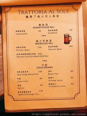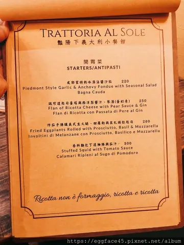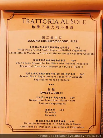 #木柵美食 #政大美食 #文山區餐廳 #動物園站天氣剛剛好的那一天,該去哪品嚐美食呢?介紹一間有質感、有氣氛、好吃、口味又道地的義大利小餐館:【Trattoria al Sole 豔陽下義大利小餐館】老闆特地遠赴義大利西西里島學做菜,堅持選用來自義大利的食材,現點現做新鮮烹調方式,讓顧客們能品味 #經典的義大利家鄉味料理。是台北少數經過義大利人認証推薦的餐廳唷!!快跟著蛋寶一同來場舌尖上的義大利之旅~ 【Trattoria al Sole 豔陽下義大利小餐館】Trattoria,是指「義大利家庭式傳統餐館」, Sole,則是「太陽」的意思, 藉由提供義大利各地區傳統的料理,傳遞及分享義大利的慢食文化,並希望來用餐的每位顧客都能藉由舌尖到義大利旅行,沐浴在溫暖的陽光之下 ▼店內裝潢以黃色為主,搭配簡單的小物裝飾,很有家的感覺,讓人一進入就感受到溫暖,彷彿進到義大利的小餐館裡。 ▼吧台裡擺放著各式搭配餐點的飲品、紅白酒。近年來餐點佐義大利酒也是滿流行又實惠的選擇!! 【菜單】有開胃菜、第一道主菜(義大利麵)、第二道主菜(肉品)…等可選擇,還有甜點、餐後酒和各式飲品、義大利紅白酒…等,可搭配餐點。目前還推出午間套餐,點義大利麵+120元或點主菜+60元,就可升級套餐,套餐均附義式普切塔麵包(Bruschetta),生菜沙拉和飲料,是經濟又實惠的品項!(詳細菜單連結請按此) 【義式普切塔麵包】晚間用餐只要點主餐,即贈送開胃菜「義式普切塔麵包」(中午需加價升級套餐才有)麵包烤的相當酥脆,上頭還放滿了淋上橄欖油的新鮮番茄,一口吃下,特別清新開胃。 【瑞可達起司蛋塔與西洋梨醬汁、琴酒】 (250元)這道瑞可達起司蛋塔,看起來像「舒芙蕾」的夢幻外表很誘人!咬下一口,有蛋香滑嫩綿密的口感,慢慢品嚐,濃厚的起司味會在口中散開,就像濕潤的乳酪蛋糕般,非常好吃! 【香料麵包丁透抽捲與茄汁 】(300元) 這可是道地的義大利家常菜,夾起一圈品嚐,透抽柔軟又帶Q彈感,內部的香料麵包丁口感相當軟香獨特,搭配茄汁,整體的風味更有層次。 ▼吃完開胃菜,接下來就輪到「第一道主菜」上桌了!這裡的義大利麵都是現點現煮,需稍微等待(10~15分鐘)才能品嚐到麵條最完美的口感。 【火辣的卡拉布里亞辣香腸醬布拉塔水牛起司與水管麵】 (280元)義大利麵條種類繁多,但蛋寶卻很少點「水管麵」(Rigatoni)今天品嚐後才發現,原來水管麵也能很好吃!水管麵和筆管麵都有著義大利圓柱的外表,但是尺寸可大上一倍呢!主廚自製的辣香腸醬,與水管麵充份拌炒後,最後淋上布拉塔起司,就成為這道卡拉布里亞大區(Calabria)經典的好料理。 ▼夾一根麵條入口,稍微偏硬但是富彈性、具有嚼勁,細細品嚐能吃出麵粉的細膩與小麥的香氣,搭配起司和肉醬鹹香微辣的滋味,吃起來很過癮,是會讓人一口接著一口吃完它的好味道 【鮮蝦與特製番紅花海鮮醬汁細扁麵】 (360元)麵條是義大利麵的靈魂,主廚特選細扁麵來搭配鮮蝦做出這道散發著濃厚海鮮味的義大利麵。「細扁麵」(Linguine) 是蛋寶最常點的麵條款式,所以好不好吃問我最準了,扁平而略帶曲線的麵條形狀,天生具有沾附醬汁的優勢,最能充份展現地中海料理的特殊風味! ▼每一根麵條都裏上了醬汁,吃起來有彈性又鮮味濃郁,搭上蝦子新鮮脆甜,鮮美的無法言喻。 【香料開心果爐烤自然豬排佐炙燒蔬菜】 (560元)包覆著各式香料、開心果的帶骨的豬肋排,送上桌時香味四溢,而這份量震撼了我的視線,讓人忍不住好想劃開一刀品嚐滋味! ▼切開厚實的豬排細細品味,肉質多汁細嫩不乾柴,搭配香料開心果吃下,會有種甜甜脆脆的滋味,這道料理完全顛覆了我對豬排的想像,也提升豬排在我心中的地位。 【炙燒美國黑安格斯肋眼牛排(10oz)佐芝麻葉】 (680元) 剛烤好的大份量五分熟肋眼牛排,擺在盤中真是令人賞心悅目,粉嫩又多汁的肉質與香味,會讓人好想立刻拿起刀叉大口完食它,更特別是,牛排下層還鋪著滿滿的芝麻葉,完全就是在義大利最流行的吃法。 ▼肋眼牛排油嫩中帶點咬勁,搭配芝麻葉更增添風味與清爽感,激推~ 吃完美味的餐點,最後一定要來份甜點,才有完美的ending。 【拿坡里珍珠薏仁與起司甜派】 (120元)這個甜派有厚實酥脆的外皮,吃一口有微甜的滋味,還會釋放出獨特的香氣,細細品味,裡頭還有珍珠薏仁QQ的口感,口感層次豐富,是一款會越吃越香越好吃的甜點。 【開心果半凍冰糕與巧克力醬】(150元)半凍冰糕是一種在義大利很受歡迎的甜點,外層吃起來有鮮奶油的滑順感,內部卻有著冰淇淋般的冰涼感,口感好吃又很特別~我喜歡!作為這頓餐點的尾聲真的很+++++加分! 【蛋寶543】比義大利人開的義大利餐廳還義大利!這一次來到「Trattoria al Sole 豔陽下義大利小餐館」,整體的餐點讓我很驚豔,彷彿讓我回到義大利旅遊時,在路邊隨意進入的一間有家常美味的小餐館一樣,有種溫暖又讓人心情放鬆的感覺,裡頭的餐點沒有過多的華麗裝飾,卻有著樸實又經典的家常美味。和老闆小聊了一下才知道,雖然他不是餐飲科系畢業,卻因為熱愛義大利美食,還特地飛到義大利西西里島學做義大利料理,店內的食材原料大多也都是來自於義大利,才能將如此傳統又道地的好味道,分享給大家品嚐!推薦給大家!! …查看更多