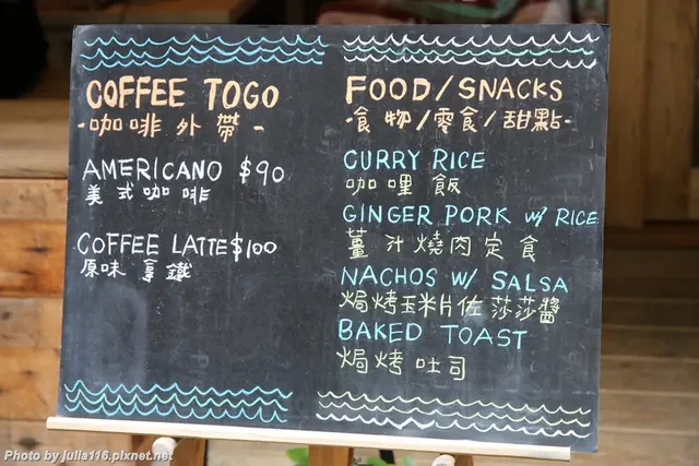 交通方式:國父紀念館站步行10-15分鐘,開燈咖啡位於四個捷運站中間,步行皆在15分內開燈咖啡是由熱愛衝浪與喜愛咖啡的兩位年輕人共同經營,隱匿在信義區小巷中開燈是衝浪的術語,是指從黎明衝浪到太陽升起,衝早浪的意思取名開燈,有為不眠衝浪手開一盞燈的寓意,因此在周末特別延長營業時間到凌晨三點從國父紀念館站走來有段不短的距離,難得今天舞媽有空跟我喝咖啡為了不讓她太辛苦最後我們還是搭小黃來的,哈哈大熱天嘛位處巷弄間的開燈說實在不算好找(好吧對我這個路痴來說),司機大哥也繞了一會兒XD很意外會在咖啡廳看到燒肉定食,我眼睛都亮了(餓了)門面簡單樸實,仔細瞧才發現許多用心打造的細節大概就是一種墾丁式度假氛圍吧,說到墾丁彷彿是上個世紀的事了,現在還有春吶嗎@@挖~門才推一半我就感覺自己會喜歡這裡了店內使用大量木質元素,裝飾的全是主人的喜好與回憶店主將興趣與工作結合,能為自己熱愛的事情忙碌是一種莫大的幸福呀整間店充滿度假氣息、風格鮮明,讓人不自覺也感染了快樂店裡幾乎每個座位旁都設有插座,連吧台下方也有,設計很周到呢"Life is like surfing, to keep your balance, you must keep moving"生活就像衝浪一樣,為了保持平衡你必須持續的動仔細看,牆上掛的全是店主衝浪照片,衝浪愛好者一定要來跟老闆認識交個捧由啊我沒見過哪個咖啡館吧台上擺這麼多酒,原來其中一位店主曾有幾年吧台調酒經驗店裡供應多種調酒與啤酒,下午喝咖啡,晚上則搖身一變為小酒館周末營業至凌晨,喜歡小酌的捧由又多了一個選擇還有這吧台也太熱鬧了吧,好歡樂喔!門口兩張沙發被我跟舞媽佔領,倚著落地窗喝咖啡、翻雜誌好愜意開燈低消每人$120元,點飲料或餐點都可以供應義式咖啡、手沖單品、酒類咖啡、茶品、氣泡飲、調酒、啤酒、簡餐、甜點簡餐部分有點認真,出現雞肉咖哩飯、薑汁燒肉飯、焗烤起司餐點或甜點另加100元可任選一杯140飲品,超過補差額焗烤起司雙層$200兩片鮮奶厚吐司、鮪魚、半熟蛋、生菜沙拉鮮奶吐司厚度很果然有份量、口感紮實,半熟蛋其實有點過熟,整體風味不錯吃完這份確實很有飽足感,是可以取代正餐的雞肉咖哩飯$190舞媽點了咖哩飯我本來很擔心,覺得咖啡館的飯應該不會好吃好啊結果出乎我們意料還挺好吃的啊,加了起司與辛香料的咖哩醬色深味濃,好下飯啊雞肉我倒是沒吃到,無法評論了貝里斯拿鐵$170 橙酒拿鐵$170兩杯調酒拿鐵長的一樣,僅以一杯作代表XD奶泡打得細緻、拉花勾勒細膩,淡淡的酒香與咖啡和諧共存,非常喜歡薑汁燒肉定食$220我們在開燈一窩就是一整個下午,所以肚子又餓啦開燈真的蠻令我驚豔的,燒肉定食也端得出來,差點忘記我在咖啡館啊啊啊定食端上來還頗有樣子,肉片分量鋪了有半碗多肉片質地嫩口、薑汁頗為濃郁,白飯拌著醬汁稀里呼嚕就吃完了一旁附有泡菜、唐心蛋、生菜沙拉,真的挺好吃的,太意外了!提拉米蘇$150 冰滴咖啡$180冰滴使用義式配方+耶加雪菲,有我最愛的果香與微酸口感,搭配提拉米蘇根本是超完美組合冰滴咖啡是夏季限定,甜點則不定時更換,以當日店家供應為準開燈的提拉米蘇酒香味很不明顯,卻不影響好吃度,甜度也適中而且分量很不小氣啊,吃完好滿足,想再吃一次完食心得:喜歡開燈營造出的度假氛圍,來到這裡真的有放鬆的感覺,尤其坐沙發特別舒服餐點設計與口味還蠻有創意且用心,定價在台北市來說也沒比較貴個人特別喜歡薑汁燒肉定食、橙酒拿鐵、冰滴咖啡、提拉米蘇後來看到雜誌介紹開燈,非常遺憾沒有點到"特調冰咖啡",是以Mojito調酒技法製作我最近超愛帶有檸檬、薄荷味的咖啡,沁涼口感非常適合夏季你們記得要點來喝喝看,我準備要再去一次了!!!…查看更多