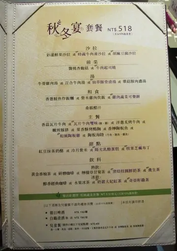 敦化南路上的陶板屋蠻好認的,紫色亮眼的招牌,很難不吸引你的注意力。位於二樓,樓梯入口稍微陡一點點。荔香鴨胸沙拉粉色的煙燻鴨胸看起來頗有嚼勁,生菜方面很新鮮,淋過荔香和風醋後更顯味。旁邊附的百香沙拉醬,酸酸甜甜的較濃稠,不過對我來說太甜了。香橙牛肉沙拉串起來的沙拉蠻少見的,看起來精緻,但想將它鬆開有一點點小困難。去皮柳橙、生菜與牛肉一起吃,有種原始美味,澆上酸甜香柚醬汁後味道豐富些。烤杏鮑菇看到這道菜名,不太會想點它;卻意外的好吃。醬燒後的杏鮑菇,味道很棒,鮮嫩柔軟,撒了點七味粉,一點也不像平時那種乏味的杏鮑菇。附註 : 旁邊還有一顆醃製梅子香蘋海鮮燒蘋果跟海鮮配在一起蠻新穎的。裏頭有洋蔥、培根、洋菇、魷魚還有主角"蘋果丁",裡面的白醬將它們融合在一起,有點像是精緻版的焗烤白菜。蘋果丁讓這道菜變得清爽不膩口。番茄海鮮濃湯外表與南瓜濃湯十分相似,美味鮮甜,搭配香酥麵包丁,相當有飽足感。香蔥鮭魚炸飯糰金黃酥脆外衣很細緻扎實,內部則是拌過奶油鮭魚與香蔥的飯糰,嘗起來口感豐富,切開夾起後不會散落。好吃呢!五目角豚炊飯由黑色迷你小甕盛起的炊飯,看到就覺得很討喜。壽司米與糯米拌入照燒後的豬五花一同炊煮,配料還有銀杏、毛豆,吃起來清爽健康,尤其米粒與豬五花一起入口,味道相左,馬上又想接一口。桑椹醋汁裏頭有些細緻小冰沙,喝起來酸甜解膩、透心涼。這類型醋汁幾乎每個人都愛呢。果香酥烤鴨胸鴨胸肉表皮酥脆,肉質鮮美軟中帶Q勁,是我吃過最美味的鴨胸肉了另外可沾主廚特調果香醬汁,不過單吃就十分美味囉。陶板海陸朋友選擇了牛肉與不帶刺的魴魚片組合,附上黑胡椒醬與茄汁醬,另外還可選雞肉或著豚肉。牛肉多汁有嚼勁,魚片裹了麵衣炸過,稍顯油膩了點。整片的紫蘇葉擺在中間,頗有秋意~紅豆抹茶奶酪奶酪口感沒那麼柔軟。蜜香紅豆,看起來就很鬆軟,配上奶酪一起吃,可以中和蜜豆的甜。盤上有點像似奶油色的就是抹茶醬,一點點的粉綠,但是沒有很明顯。這麼偏粉色的抹茶醬,倒是第一次看到。芒果優格布蕾黃澄澄的芒果色,吃起來比奶酪細緻綿密些。莓果美妍茶(HOT)有一丁點酸味的莓果茶,壺裡還有蘋果小切片,附上砂糖。這杯子的螺旋讓我想起MUJI的白瓷馬克杯,真漂亮。蜜香烏梅飲(ICE)攪拌前的烏梅飲,顏色相當深沉,味道似乎很濃醇。友人喜歡它的酸甜滋味。可以自行攪拌,體會杯中色澤轉換也是一種趣味。和風洋食的吃法,多了點健康感。…查看更多