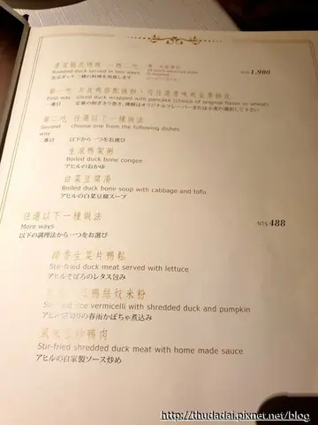 這次香宮一役真提醒我最好別在年節期間來此類餐廳吃呀,否則得要有充分的心理準備,因好不容易約到大年初一與兩位損友同行,So...這趟食記就盡量簡單帶過,相信與平時水準應該有很大落差吧,就連服務也蠻粗糙的。(招待:黃金泡菜)<雙味鴛鴦蝦球 NT$980>開頭這道還不錯,鹹蛋黃和芥末美乃滋兩種口味,薄薄一層柔順、滋味濃淡適宜,鹹蛋黃蝦仁表面是仍維持酥脆感的。<干煎美國純種和牛柳 NT$1,280>當日最不ok,如果是280元可能就沒什麼意見,心想會否有切分大小的問題,也許非平時做法?因為真的很小顆也顯得內裡過熟(可對照一旁筷子..),總之若要年節期間來吃千萬別點。<金盅田翠八景 NT$688>屬於預訂菜,裡頭有白果、蘆筍、夏威夷豆、杏鮑菇、南瓜、百合、甜椒...炒製的味道規矩、勝在口感豐富,適合不好決定要配什麼青菜時,就先預訂一盅,吃完服務員會端走底下的南瓜再切塊(但是南瓜不好吃)。 <脆皮烤鴨二吃 NT$1,980>主角上桌,聽說非常棒的烤鴨,但這次感覺雖然好吃但明顯不驚艷(就說應該與平時不同了),包鴨皮比皮+肉好,某些部位的肉甚至略柴,餅和醬則都不錯,二吃選了鴨架子白菜豆腐湯,顏色頗為濃白,但喝起來還好,友人說剛端上時一喝,少了點鴨與湯的融合度,之後再喝慢慢就有了。<蛋白杏仁露配油條 NT$180>油條酥脆,除了殘油稍微多以外,其他都還ok~…查看更多