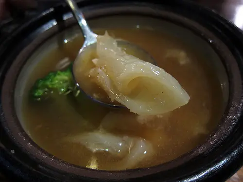 蔓羅沙拉佐蘋果烏魚子 ~ 第一次吃烏魚子,好似是醃製過的,合著蘋果吃不錯哦上湯花膠 ~ 女人美顔恩物,很入味的厚肉,感受到選材並不隨便,有驚喜