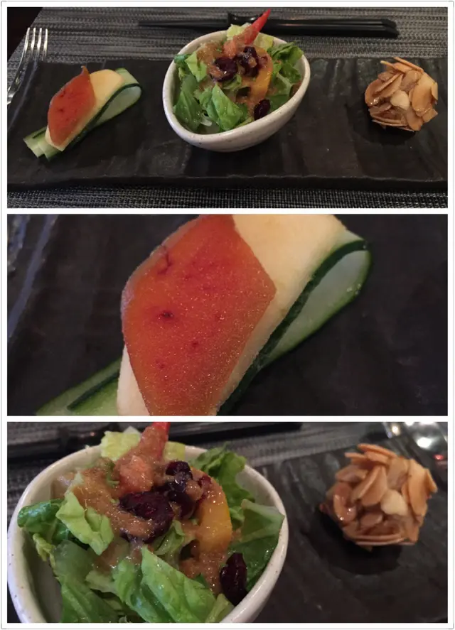 簡單介紹了一下,我們選擇了1⃣️ 商業套餐B =NT$8802⃣️ 套餐加配鮑汁海參= NT$1750含10%服務費一共NT$2893,折合港幣大約680以上兩個套餐都有:沙律拼蘋果烏魚子,上湯花膠,葡汁鮮蝦,香煎時令鮮魚,雞湯,臘味飯,甜點及水果2⃣️號套餐還有:三鮮化,番茄沙司鮮元貝,鮑汁海參,而上湯花膠的份量會再多一些好了,開餐囉!喝完一口茶,先上沙律,清新一下