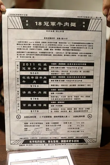 台北的通安街上大半夜的大概也只有『18冠軍牛肉麵 』還亮著燈 而且越晚生意越好 距離最近的捷運是六張犁站及信義安和站說到18冠軍牛肉麵就不得不提到以前台北知名夜店-room18room18的牛肉麵也是榜上有名 傳聞中是以前room18的員工消夜只能說room18的員工太幸福了!!後來經過調整後參加2011年台北國際牛肉麵節比賽還榮獲了紅燒組冠軍因此在牛肉麵界是聲名大噪 台北牛肉麵推薦光 google上評論就有七百多則 分數高達4.4分 評價相當高算是台北大安區捷運六張犁、信義安和站消夜、牛肉麵、雞湯麵推薦網友讚譽台北最強雞湯麵,紅燒冠軍牛肉麵更是不能錯過羽諾的18冠軍牛肉麵總結『18冠軍牛肉麵』的生意好 真的是有相當的實力的除了服務不錯外牛肉麵、百菇雞湯麵真的都非常棒尤其百菇雞湯麵的湯頭有夠濃郁每口都是帶有微微黏唇的滿滿膠質 而且還能續一次湯蒜片塔香炒磨菇、油蔥土雞腿、招牌香辣炸雞翅也是相當有水準的而且用餐環境也很棒 冷氣也夠強 不用擔心吃得滿頭大汗了台北大安美食|18冠軍牛肉麵,信義安和、六張犁必吃牛肉麵、網友譽為台北最好吃雞湯麵 這天晚上11:00過來時本來還很怕會排隊畢竟每次經過18冠軍牛肉麵 不論什麼時間店外總是會排著長長的人龍還好這天羽諾的運氣好 一來就有座位 不過羽諾進來後 後面上門的客人可就要乖乖排隊了不好意思 店內最後一個座位被羽諾給佔據了 哈店內座位數不多但這時間點人潮能滿到不行也算很厲害了 18冠軍牛肉麵除了有提供餐點外 冰箱也有販售一些飲料有需要的朋友可以取用醬料及餐具都是自行拿取這邊還有提供而兒童餐具 蠻貼心的!在這邊喝完湯後 可以免費再續一次第二次後 加一次$30元18冠軍牛肉麵的湯頭都算蠻好的 羽諾認為非常值得 18冠軍牛肉麵的完整菜單除了店內招牌牛肉麵及百菇雞湯麵外也有許多小點可以選擇 感覺像來到餐酒館~ 18冠軍牛肉麵|油蔥醬土雞腿100g $100不得不說這土雞腿真的有夠鮮嫩 淋上香噴噴的油蔥醬口感更是一絕 香嫩好吃 可能太好吃了 一上桌就吃光光 總覺得這份量吃的不過癮 18冠軍牛肉麵|燙高麗菜$40 燙高麗菜簡單淋上油蔥酥就很有味道 清脆又爽口~ 18冠軍牛肉麵|蒜片塔香炒磨菇$148蒜片塔香炒磨菇可是網路上網友激推必點的小點用九層塔炒的蘑菇香氣十足口感又多汁這實力已經贏過許多餐酒館了 18冠軍牛肉麵|招牌香辣炸雞翅$90招牌香辣炸雞翅更是讓羽諾驚艷微辣香酥的表皮入口還能聽到響亮的喀滋聲 裏頭的雞肉則軟嫩入味也難怪許多來這邊的客人大多都會點上一份炸雞翅這實力在外面單賣大概都可以闖出一片天18冠軍牛肉麵|紅燒半筋半肉牛肉麵$153 這邊的紅燒半筋半肉牛肉麵也不賴牛肉是厚切的 但口感卻意外地細嫩完全不會怕切太厚而口感不佳雖然牛肉量給的不多 但也能讓人吃的滿足這牛筋軟Q程度有圖有真相熬煮到非常軟 幾乎入口即化大口咬下能充分感受到滿滿的牛肉湯汁 好好吃啊~這碗點的是寬麵所以不會覺得湯汁及麵是一體的比較可以說是牛肉湯掛附在韌度極佳的寬面上吃的到麵條嚼勁又感受的到湯汁的美妙 18冠軍牛肉麵|手工牛肉丸$18這手工牛肉丸的口感有點像紅燒獅子頭 蠻鬆軟的滋味不錯但羽諾更愛其他小菜18冠軍牛肉麵|百菇雞湯麵$178這百菇雞湯麵實在太強大雞肉已經先幫我們切好 所以不用啃骨頭雞肉軟中不失彈性 非常好吃 除此外還看的到滿滿菇類 許多不吃牛肉的朋友都會到這邊來吃碗雞湯麵可能百菇雞湯麵太厲害了所以許多網友總調侃著18冠軍牛肉麵是被牛肉麵耽誤的雞湯麵店 湯頭的香氣醇厚滿滿的膠質讓嘴唇多了些黏性喝完一次後還能免費再加一次湯這湯能喝到兩次太幸福了細麵也有細麵的好處吸收這樣的醇厚湯汁更容易每次吸上一大口麵 口中都能釋放出馥郁的雞湯香氣吃過一次後終於見識到18冠軍牛肉麵每次大排長龍的實力了 如果半夜肚子餓 來這邊用餐還真是一大享受羽諾這次的介紹到這邊 希望大家喜歡經過附近時不妨也來嘗嘗看吧!!…查看更多