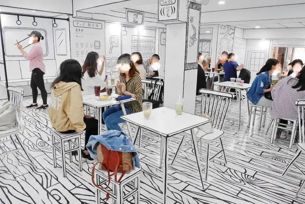 2D手繪黑白咖啡館,讓人一秒走進漫畫世界中!今年五月中全新開幕的【2D CAFE】,一開幕馬上吸引許多人前來朝聖。整間店最大的賣點,就是那黑白線條漫畫風格的用餐環境,讓人拍出一張張吸引眼球的照片,瞬間攻佔了網美網帥們的IG版面。整間咖啡館從裝潢、桌椅到餐具皆以黑白色系的2D漫畫風格來呈現,以白色為底,黑色手繪風格線條為主,讓所有現實生活中的立體物件,在視覺上瞬間變成白紙上的卡通了。咖啡廳大門化身成偽飲料販賣機,旁邊的手繪門是假的,似真似假的繪畫場景,著實讓人虛實難辨,也非常有趣~ 【2D CAFE】目前不接受預約訂位。 一進門,先在櫃台點餐、確認座位。這裡提供簡單的糕點和飲料,沒有鹹食餐點,比較適合下午茶來訪喔。店內的手繪作品來自於馬來西亞的畫家團隊以黑白元素呈現二次元風格。咖啡廳內有電車車廂、便利商店、日式酒館、洗衣店、廚房…等場景,可以讓大家好好餵飽記憶體,是絕對沒有問題的。日本電車場景,連拉環都有了,非常有意思~坐的椅子也畫上了線條,馬上變得平面感十足。基本上,可以看到店內的客人都是隨意走動,到處拍照的。 拍完了一樓,別忘了到樓下B1,有更多的驚喜場景可以繼續拍拍拍。腳底下踩的樓梯也都手繪變成平面了。B1單純是拍照場景,沒有用餐座位,別忘了打開洗衣機門,鑽進去還有廚房場景喲!廚房場景提供了道具鍋子、鍋鏟和圍巾,讓大家可以拍得盡興~和姐妹聊天下午茶之餘,還可以瘋狂拍照,在疫情期間,不能出國,也是種小確幸呀! 接下來,看一下我們點的餐點。所有餐點價格都落在200元內,不收10%服務費。2D招牌拿鐵 140 NTD.金品紅韻 100 NTD.2D重乳酪蛋糕 110 NTD.鮮濃乳酪 80 NTD.肉桂捲 65 NTD.整體來講,這次是帶著拍照的心情來的,但餐點的口味都還算不錯; 不過用餐環境算是比較開放性的 (大家都在身旁走來走去拍照),若真的要談事情、聊心事,就不是那麼推薦了。最後,附上咖啡館的MENU,給大家參考、參考~ …查看更多