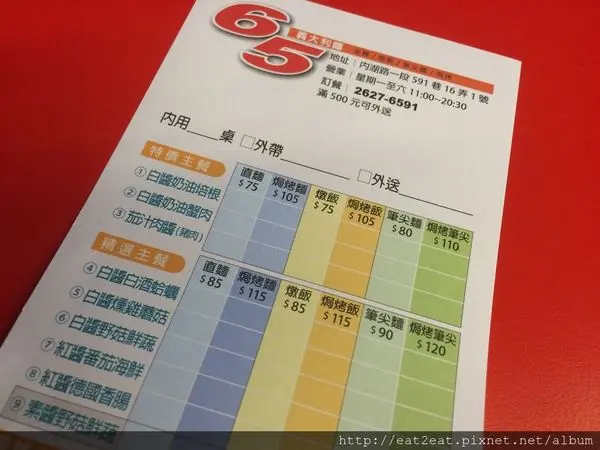 65義大利麵/燉飯 (台北) 網址: https://s.openrice.com/cHRSm02rDu600 地址: 台北內湖區內湖路一段591巷16弄1號 電話: +886 0226276591