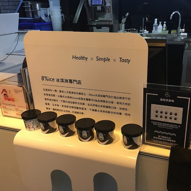 認識這家店全是因為我的instagram好友 (哈哈, 這年代才來愛網上交友 XD Henry介紹的我猜他可能在這家店附近工作吧, 看他早陣子幾乎每天都會post這家店的冰淇淋上instagram. 也幾乎每天都吃不同口味, 讓我超想一試! 這家店又好幾家分店, 我就去了永康街附近的本店說是冰淇淋店, 他們有硬的意大利冰淇淋 (gelato), 也有霜淇淋當天是星期六下午, 人好多, 但也細心的選要吃那一款, 因為, 價錢不便宜, 所有款都要100NT店內也有不少的藝術擺設, 在等或在吃的時候可順道欣賞一下.還有diptyque的蠟燭, 不過就不知道是裝飾還是可以給客人買了冒著被人一直撞來撞去的情況下也要拍他們的口味給你們看 XD 超多特別的口味,所以就真的想了好久之所以叫做8%, 是因為意大利的gelato脂肪含量只有8%, 所以店以此命名. 他們的冰淇淋都是主打健康, 成分全天然, 加上店內的藝術作品, 讓大家的咀巴跟眼睛都吃冰淇淋想要一次過吃多款口味就最好點綜合的~ 霜淇淋部分我想吃抹茶, 看到雪鹽黑糖二話不說點了霜淇淋本身不會太易溶化, 因為都拍照拍了好一陣子. 抹茶沒有我想像中的甘, 但最起碼他沒有和茗的甜, 也是不錯. 雪鹽黑糖超好吃的! 黑糖的味道很突出, 但又不會過甜, 雪鹽的鹹剛好帶起了黑糖的味道, 推薦這口味, 真的好吃呢gelato部份點了藍莓芭娜娜, 還有黑芝麻. 兩款吃起來都沒有霜淇淋的那種軟滑感覺, 味道也比較清新一點. 芭娜娜其實就是香蕉口味啦, 加入藍莓的酸出奇地搭耶, 很不錯, 香蕉味道很天然, 愛吃香蕉的一定會喜歡~ 黑芝麻本身我沒有很愛吃, 是男友選的,味道有很濃郁的黑芝麻味道, 也不會太甜, 都不錯查看更多
