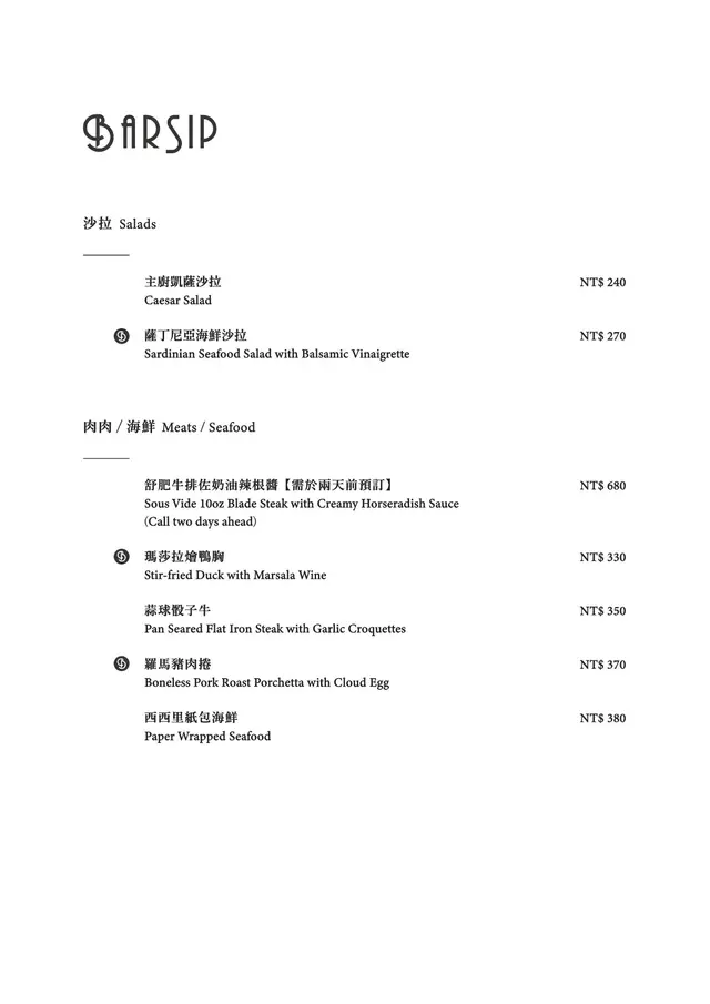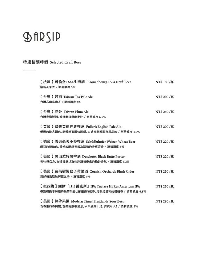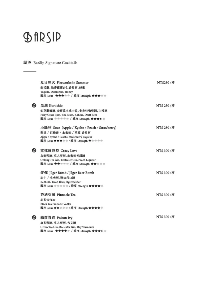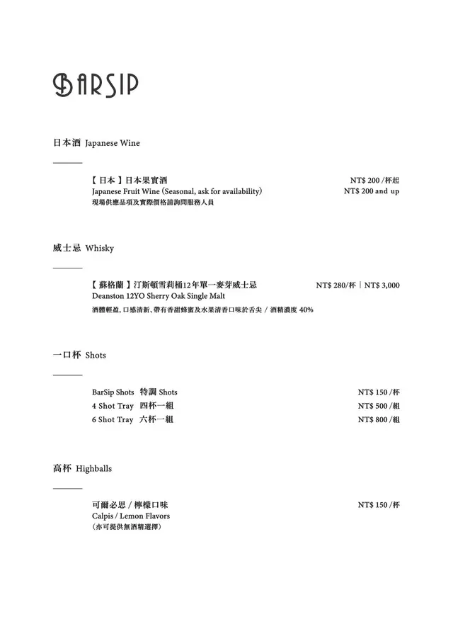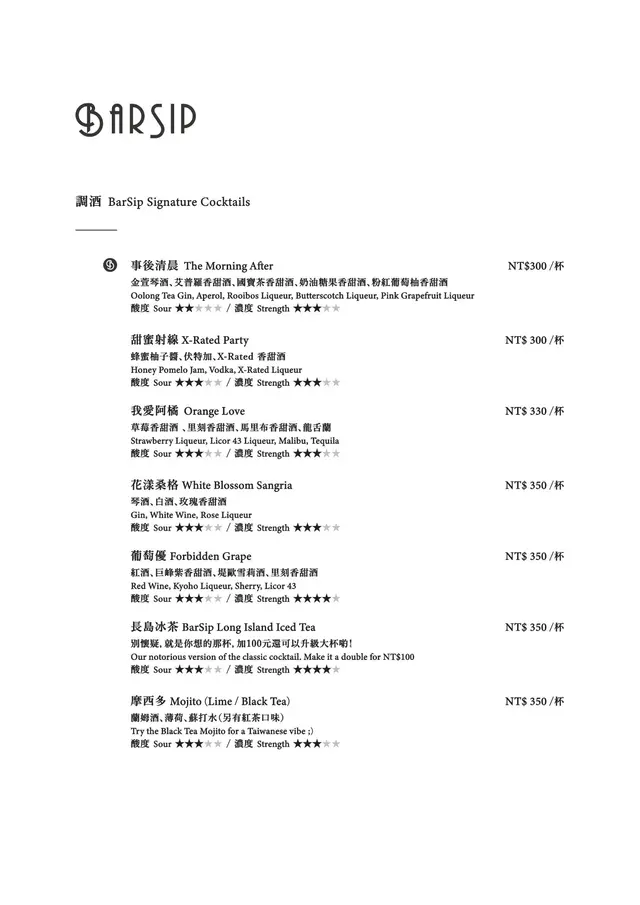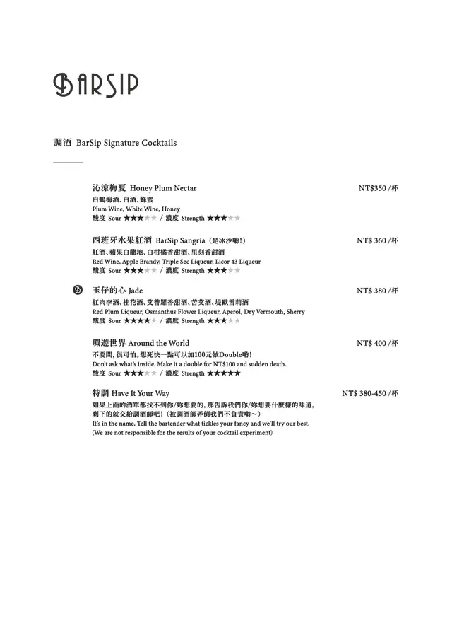 BarSip餐酒 (台北) 網址: https://s.openrice.com/cHRSm02hwS600 地址: 台北松山區南京東路三段303巷14弄6之1號1樓 電話: +886 0227127677