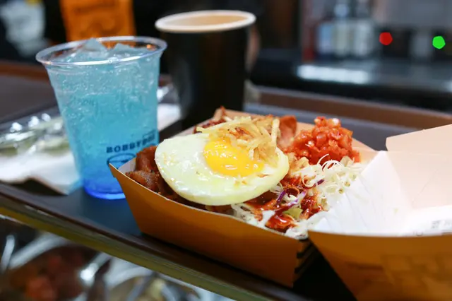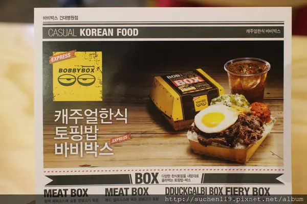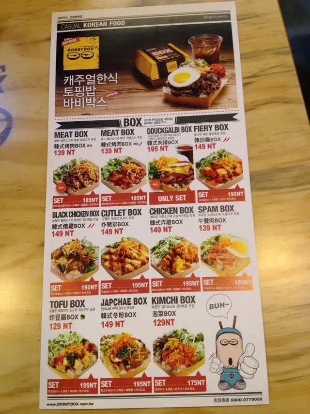 來自韓國的潮流飯盒就位於台北微風廣場對面招牌醒目還不斷的提醒各位飯桶:飯比較好雖然hsuan研究了好久還是研究不出個所以然??總之就是吃飯good囉~~工業風設計最近真的很流行黃橙橙的更讓人想一探究竟櫃檯前及上方都有菜單不收取服務費結帳後會給一個美食街都會有的小牌子亮燈時到前取餐裡面空間其實不大以木質桌椅為主正前方則有投影設備播放的也是韓國流行音樂也提供一些可愛牌子讓女生拍照打卡XD享用完餐點之後記得回收~~hsuan當初上網填表單時只寫了2份餐點現場也不能追加,但是點心飲料可以!!雖然便當帶給人方便但是餐盒及餐具的塑膠袋是hsuan覺得比較不好的地方首先先來介紹飲料藍柑口味雞尾酒汽水(無酒精)喝起來很像雪碧,顏色很吸引人韓式咖啡(摩卡)友人覺得蠻好喝的,如果不甜更好!看看這飯盒圖案雖然感覺有點欠扁不過也挺逗趣的XD韓式烤肉(原味) 套餐 NT185附上飲料,辣蘿蔔,太陽蛋肉片部分屬於厚的不過感覺做好很久所以吃起來有點乾旁邊的太陽蛋煎得不錯但也不是現煎...挺失望的一旁還有高麗菜絲淋上美乃滋及辣蘿蔔很開胃,配上米飯也不會突兀韓式肉排套餐NT195附上太陽蛋,起司片肉排一共有兩塊表皮還有脆脆的口感肉也很軟嫩略帶甜味起司片沒有融化小可惜..但整體來說肉排的肉質嫩度比烤肉好很多!!!!韓式辣味醬燒炸雞NT119炸雞很多塊但也不大塊嫩度還可以麻麻辣辣的年糕則吃起來像是甜不辣的口感稍微軟嫩菜單參考!!整體來說價位上勉強還可以接受味道上普通,再訪率不高…查看更多