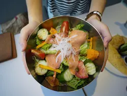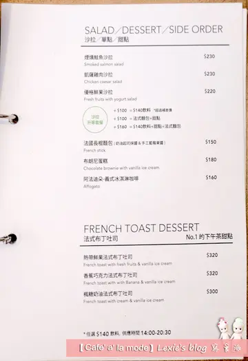 Cafe a’la mode 位於中山站附近巷子裡的早午餐。溫馨小店,簡約安靜,東西好吃,這是我對Cafe a’la mode的評價。Cafe a la mode在台北有兩間分店,一間在師大一間在中山,公休時間有錯開,若不巧遇上其中一間公休可往另外一邊飛奔。假日我最喜歡做的事情就是中山站附近走九遍,尋找巷弄裡的每個驚喜。中山站附近的巷弄裡也很爭氣的不斷冒出新店家,怎麼吃都吃不完。Cafe a’la mode位子在稍微後面一些的巷子裡,沒想到我這麼久之後才遇見他。遇見他之後,一個月裡面吃了兩次,這頻率安撫了我們的相見恨晚。白色的外觀,外頭用盆栽點綴了一些顏色。Cafe a la mode就在眼前,讓我們一起進入享用早午餐吧!店內桌數不多,桌與桌之間隔的有點近,聊天隔壁都能參與這是缺點。優點是因為即使空間不大,也不會有整間店很壅擠的感覺。即使外面是條普通的馬路,有了綠色植物點綴,瞬間變美了。Cafe a’la mode菜單太多頁我就不放了,價位大概在300左右,以中山站來說算是正常的價位。順帶一提,這邊店員都是蹲著幫大家點餐,讓我覺得有點害羞,怕他們蹲的太辛苦腦中只想著趕快點完餐。有人與我就是來吃早午餐,所以各點了一份早午餐。所以各有一杯果汁跟紅茶(也可以選美式咖啡),只可惜紅茶只有熱的。早午餐的蔓越莓果汁喝的到果粒,這點讓我有點驚訝。美式經典早午餐 270元內容物有:火腿、培根、沙拉、炒蛋(或太陽蛋)、薯泥(或薯餅)、歐式麵包(藍莓果醬/奶油)。經典美式就沒什麼好說的,友人說薯泥還不錯且他喜歡Cafe a’la mode的奶油醬。德國香腸早午餐 270元我特愛德國香腸的口感,每次看到都會想點一下。早午餐的內容物都差不多,但還是有可以自行選擇的內容,例如我選了太陽蛋、薯餅及藍莓果醬。我還蠻喜歡他們家的薯餅,一絲一絲真的很有口感,不是想像中早餐店那種薯餅。另外我想提一下他們家的藍莓醬,選得很好,吃得到果粒且味道很棒。如果跟我一樣喜歡在中山站閒晃,不知道要選哪個餐廳來填飽肚子的話,或許可以選擇Cafe a’la mode喔!…查看更多