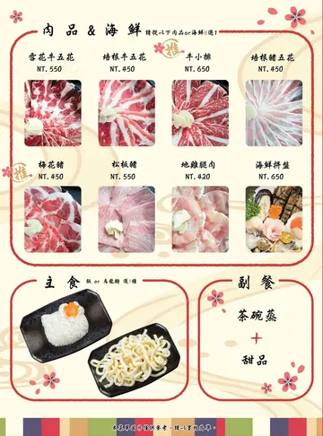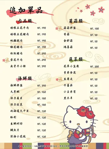 ▲門口就能看到身價『40萬』的HELLO KITTY公仔,端著鍋物來迎接每一位客人的到來▲進門左手邊還擺設兩張候位椅▲收銀台設置在進門右手邊▲收銀檯旁有HELLO KITTY周邊商品販售▲有包包、保溫瓶、餐具、文具用品、絨毛玩具...等商品,價格都不便宜,所以看看就好唄!!▲店內的HELLO KITTY公仔頭上是兩朵盛開的山茶花,搭配上以木製材質為主體的裝潢,營造出濃濃的日式風格。▲廁所還滿小間的裏頭也沒有HELLO KITTY裝飾,感覺相當的LOW ▲桌面上所有的餐具皆有印製山茶花Hello Kitty,另外杯墊是可以帶回家的唷!!▲火鍋蓋是純木頭製的,上面也印有 山茶花Hello Kitty,另外大家注意到了嗎?連鐵鍋邊緣旁的把手上,也有山茶花Hello Kitty耶!!▲店家還貼心提供夾鏈袋、圍兜兜、髮圈這三樣物品▲MENU封面是木製的,上面印有HELLO KITTY Shabu-Shabu鍋字樣湯底選擇有北海道昆布湯、招牌地域麻辣湯、鮮蔬豚骨湯、活力充沛番茄湯這四種,其中昆布與番茄為素食湯底。用餐部份為個人鴛鴦鍋套餐,每個人可選2種湯底,肉品或海鮮8選1,白飯或讚岐烏龍麵2選1,內含茶碗蒸、菜盤及餐後甜點。價格介於$420~$650之間特殊套餐部分有新鮮野菜素食鍋$350和海陸饗宴鍋$750,另提供沙拉、小菜、炸物、甜點、飲料....等選項。每個人低消390元,120cm以下孩童低消150元,所有內用餐點均酌收10%服務費▲沾醬提供:胡麻醬(左)與橙醋醬(右) ▲菜盤分量還滿大的,內有高麗菜、花椰菜、香菇、南瓜、芋頭、Kitty豆腐、玉米、番茄....等,食材樣式可說是非常多種類▲活力充沛番茄湯(左)北海道昆布湯(右)一開始溫度開太高,沒注意到湯已經沸騰,所以番茄湯有點滾出來,畫面有點給它難看▲招牌地域麻辣湯(左)鮮蔬豚骨湯(右)坦白說這4款湯頭味道都不差,只是裡頭的『鮮味』很類似加了味精或人工添加物的味道 ▲另外還提供Hello Kitty造型的膠原蛋白高湯凍,每個湯頭皆放一顆▲白飯有塑形成Hello Kitty輪廓樣貌,只是型體似乎不是這麼明顯▲讚岐烏龍麵因無法塑形,所以只放了片紅蘿蔔小花作點綴松阪豬培根牛五花雪花牛五花 海鮮拼盤肉品品質都還OK,但海鮮就整個大打槍,尤其是蚵仔整個『腥』到不行,吃一口就讓我吐出來,只有天使紅蝦吃起來還OK,其他就非常的不新鮮。▲剛好我們這桌有人吃素,所以就拍了一下素食所提供的菜色蝴蝶結墨魚丸$150Hello Kitty QQ燒$160這道上桌的時候大家有點傻眼,這Hello Kitty樣貌未免太不行明顯了吧!!花160元單點拿到這樣的品質,真讓人覺得很不爽Hello Kitty福袋$120坦白說單點的項目不管是造型或味道都不是讓檸檬太滿意,這麼貴的價格應該做出相對的水準才是茶碗蒸茶碗蒸是以蘋果容器盛裝,味道還算OK▲蒸蛋裏頭放入配料還挺多的,有百果、雞肉、蝦仁 ▲這是當月壽星所招待的大福,裡面包的是花生餡 餐後甜點是蕨餅,味道很像黑糖凍 金橙泡泡$100風味相當清爽,味道不會太甜,裏頭還放了兩顆Hello Kitty造型的柳橙果凍香蕉草莓慕昔$120草莓和香蕉的組合味道還算不錯,不會太過突兀夢幻泡泡$150這杯是由檸檬、冬瓜、彈珠汽水所組合成的飲品,味道稍微偏甜了一些。喝完之後服務人員還會過來詢問,彈珠汽水瓶是否有要帶回,如果要帶回他們會洗淨打包好給你,相當貼心 冰箱爬出檸檬 服務表現還算不錯,但餐點品質有待加強,整體價位偏貴,裝潢也SOSO,是吃一次就不會想再訪的店
