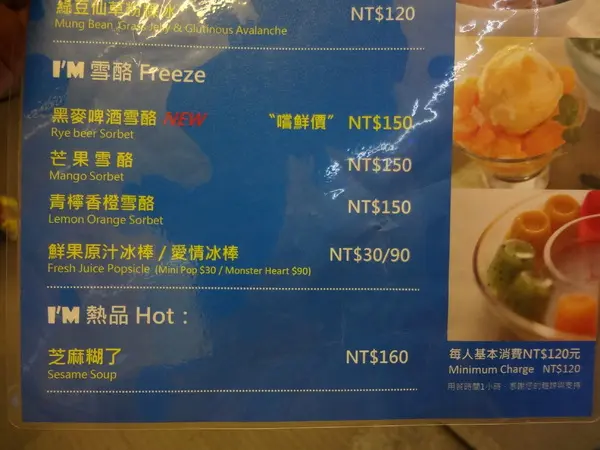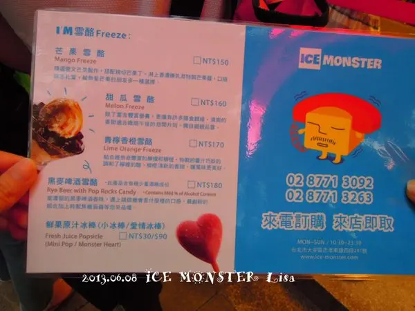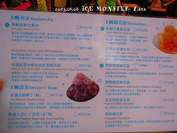 吃完了Café MUJI之後就來到微風松高準備來吃Ice Monster了他們家非常有名呀但老K一直覺得太貴所以還沒吃過這次因為手上微風APP還有點數可以折一百元這樣吃起來就很便宜了所以就算天氣滿冷的還是要來一盤冰啦XDIce Monster就位於微風松高1樓不是很冷嗎?竟然還客滿啦XD不過還好吃冰很快先去排隊點冰吧這次來就是要吃草莓冰呀第一頁的新鮮草莓綿花甜看起來很好吃重點是到2017.1.3止有打85折哦另外一樣打85折的商品是紫米芋頭粥優惠的日期也是一樣其他商品就是原價了其他綿花甜的冰綿花甜就是雪花冰本來也想點這原創新鮮草莓冰但草莓綿花甜比較吸引人呀而且還有打85折只好忍痛放棄了XD這邊是雪酪系列比較小碗適合一個人吃還有冰棒現場沒看到有人買最後面就是甜湯了也是沒看到有人吃看了一下現場最多人吃的就是新鮮草莓綿花甜、新鮮芒果綿花甜跟珍珠奶茶綿花甜這三種因為現在不是芒果的季節所以如果點新鮮芒果綿花甜的人水果可以選別的就看到有人草莓配芒果綿花甜這裏只有現金交易低消110元用餐時間一小時二個人點一碗冰就有低消了吃冰時間也不會太久所以還滿合理的輪到我們了新鮮草莓綿花甜打85折所以變成204元用微風APP又折了100元所以這碗冰只要104元太划算了XD冰來啦煉乳會另外附一小杯在旁邊除了綿花甜之外還有一球的草莓雪酪跟新鮮草莓本來還有手工奶酪的但我們都不敢吃所以就沒加啦翻過來後面長這樣一層一層的好可愛吃起來真的有點像在吃綿花糖只是沒那麼黏草莓味不會很濃就微酸微甜這樣還滿好吃的雪酪的草莓味就濃郁很多酸甜的層次感又重點了沙沙滑滑的很好吃搭配著下面新鮮草莓更好吃當然你也可以淋煉乳一起吃他們家的煉乳奶味不重但老K還是不愛XD美姬她偷偷淋了另外一邊的煉乳那邊老K不能吃了啦XD下面除了新鮮草莓之外還有草莓醬更酸甜搭配綿花甜有不同的味道一碗草莓冰可以吃到這麼多種不同的味道還真的特別呢K的小叮嚀:終於吃到他們家的草莓冰了啦 新鮮草莓綿花甜好吃呀 如果不考慮價位 老K會想一直來吃呀XD 不過以這樣的內容也不能算是很貴 就是不能常吃這樣 沒吃過的朋友可以吃一次看看 老K等夏天再來吃芒果冰好了XDK的私評(滿分10分越高越好)美味:8.5分CP值:7分用餐環境:6.5分價格:6分…查看更多