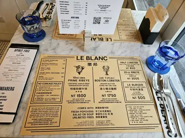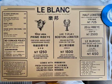 身為老夫老妻的我們已經很久沒有渡過情人節啦!情人節對於我們來說只是一個吃大餐買東西的藉口而且我個人很不愛去吃所謂的情人節套餐,差不多平日可以吃到的餐點可能變了些花樣 ,加了一些餐點,價格就好幾級跳身為節省人妻的我,當然不會想白花這些錢啦(嗯?)前陣子關注到一個YOUTUBE介紹了一家她稱之全台北CP值最高的牛排館,吸引了我上網路查了查,發現YOUTUBE介紹的就是Le Blanc牛排館,查了網路上的介紹文跟評價,感覺滿不錯的就預約了補班日前往用餐Le Blanc店址在大安路一段上,附近餐廳美食超級多的!白色的建築物是一家HOTEL,牆面是藍色系,相當顯眼店內滿滿的用餐客人,我還以為今天補班來用餐的客人不多,殊不知一堆人跟我們一樣不用補班來吃大餐整家店內的坐位都被坐滿了!沒預約還真的吃不到 以上菜單提供給各位參考!主餐有10OZ肋眼牛排$1000元,波士頓龍蝦$1400元以上二種套餐包含手工約克夏麵包,季節沙拉或是湯品(二選一),無限量薯條如果你又想吃牛排又想要吃龍蝦,可以加點半隻龍蝦680元每個人低消為一份主餐或是1000元,Nancy詢問過了400元的牛排肉漢堡也是屬於主餐之一,可抵低消但牛排肉漢堡沒有附手工約克夏麵包,季節沙拉或是湯品喔!但也有滿滿的薯條除了主餐之外還有不少附餐可以加點 我加點了半熟太陽蛋直接加在牛排肉漢堡上le blanc牛排的餐點皆沒有附飲料與甜點,以上都需要加點,加點都是原價沒有特別的優惠價喔不過甜點與飲料的價位相對於類似的餐廳親民許多 想喝酒的朋友也有酒類提供選擇自備酒品不需要開瓶費,但更換杯子需要酌收100元(難怪隔壁桌的客人自備了紅白酒喝得好開心阿)記切未滿18歲不得飲酒,喝酒不開車,開車不喝酒單點飲料:(後)無糖大吉嶺紅茶/SPICED YELLOW大吉嶺紅茶可以選擇需不需要附上糖漿SPICED YELLOW以新鮮萊姆汁與黑胡椒鳳梨汁為基底加入氣泡水,喝起來酸度高,非常的解膩10OZ肋眼牛排中所附的季節沙拉或是湯品二選一,當日湯品是胡蘿蔔濃湯,身為挑食鬼的老公不吃胡蘿蔔就跳過湯品 選擇覆盆子沙拉,端上桌視覺效果好加分喔層層推疊而成的各懂新鮮生菜,上頭放上數片刨成薄片的起吃豔紅色的覆盆子醬相當吸睛,入口可以直接感受到覆盆子的果酸與生菜的脆口度不嗜酸的朋友請慎入 手工約克夏麵包這麵包也長得太喜感了 手工約克夏麵包吃起來表面酥脆中間QQ的,有點像口感比較Q的傳統雞蛋糕的口感牛排肉漢堡+太陽蛋我覺得額外加點的太陽蛋讓牛排肉漢堡看起來更好吃了一旁搭配的薯條份量超多了!炸得剛剛好的薯條脆口鬆軟,一點都不會有油膩感!薯條上已經有灑過鹽了偏愛重口味的朋友也可以搭配上蕃茄醬 黃澄澄的太陽蛋真的好吸引人喔~剛剛好的熟度相當嫩口 誘人的太陽蛋底下是融化的起司還有超厚的牛肉漢堡肉來來來個橫切斷面~有沒有看到啾西的肉汁流下來了!le blanc的牛肉漢堡好好吃,這口感還有啾西的程度令我們驚豔跟喜愛!連漢堡麵包充滿奶香烤得微微酥脆平常不太主動吃麵包皮的我,也停不下口吃了大半個再加上鮮嫩可口的太陽蛋更是加分,濃郁的蛋黃加上啾西的漢堡肉,口感紮實不鬆散但又不會過硬二者組合搭配正中我倆的心跟胃阿~ 10OZ肋眼牛排(店員建議熟度3分熟)我們跟隨點了3分熟因為今天的客人太多了,所以牛排主餐等了有點小久差不多我的漢堡都快吃完了上桌XD牛排上的薯條是可以無限續加,不過二盤的薯條份量真的很多了!都快吃不完了,所以我們就沒續點了(薯條控記得來多吃一點喔) 3分熟的熟度,粉紅色澤真好誘人阿~先直接單吃享受牛排的原味,一口入甘甜的牛肉滋味充滿口腔!口感暖中帶點咬勁 真的會讓人一口接一口停不下來!肋眼牛排有油脂但又不會過油我們覺得搭配一旁的辣根醬也很好吃喔這盤牛排也讓我們豎起大姆指來 草莓起司蛋糕大概是因為同時用餐的客人太多了!服務人員忙到不行,所以一直忘了上我們最後的甜點了這樣一份賣100元真的不貴,口感偏軟的起司蛋糕酸味不高,加上新鮮的莓果很爽口首訪Le Blanc真的非常不錯!千元就可以吃到好吃10OZ的肋眼牛排套餐,牛肉漢堡我們也絕得很讚如果口袋荷包有點淺可以跟我們一樣點一份漢堡+一份牛排,二個人就達低消的標準了Le Blanc無論是餐點或是服務都表現的可圈可點,難怪補班日的中午還客滿了!想吃一定要先訂位才不會撲空喔