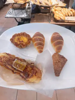 雖然不算是個麵包控,但蠻愛吃蛋塔和奶油捲。路過這家麵包店發現不用排隊(網上說有時候要排10多人,店內人擠人👀),所以當然要試一下!🔅雪花鹽奶油捲 (NT$45)用了日本製小麥和很有名的echire奶油,吃起來不輸日本吃過的鹽奶油捲!🔅義式蛋塔 (NT$80)千層蛋塔塔皮夠脆,中間蛋漿烤到微焦糖,但蛋味不算很香🔅蜂巢法蘭西很少見有蜂巢在法式吐司上面,視覺效果不錯!不過可能沒有回烤,吃起來就普通💬整體來說麵包款式超多,cp值不算高,味道不算驚豔,經過可以買,不用特地試的感覺😂