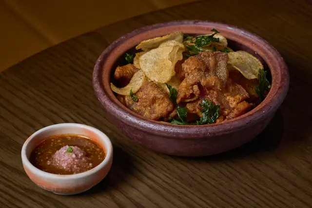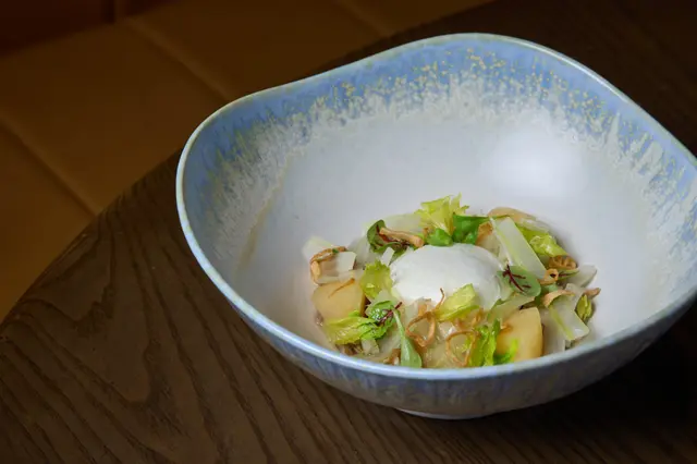B哥的邀請再次盛情難卻~~喬了個年假尾聲順勢與好友們聚餐,新Chef Erik陳加朗上任(歷RAW、FRASSI),近期推出了新套餐,幾道有帶入發酵的元素,朋友給了我她對這餐的記錄如下,其餘我再對照片做點補充。新主廚Erik在小食方面優秀且走出自己風格,尤其是泰式鹹水角和蟹味噌蝦春卷。泰式鹹水角,皮薄微辣、綠咖喱肉餡噴香,頗有特色,與一般港式不同,多了一些耐人尋味的風韻,整體融合度與完成度堪稱佳品。蟹味噌蝦春卷在撇油上做得很不錯,蝦與豬板油的內餡加入蟹味噌,調和鮮潤不膩口,值得推薦!至於套餐,主餐的鴨胸表現蠻好,沒有禽類的腥羶味,柔美多汁。(單點菜單,不過這次吃到的是新單點菜色,即前面所提~泰式鹹水角和春捲)(開胃小點三道: 育空黃金馬鈴薯/生蝦塔塔/拇指檸檬/烏魚子、帝王蟹腿/櫻花蝦/鎮江醋、風乾番茄/瑞可塔起司/羅勒康普茶/金華火腿)(Cocktail第一杯,刺蔥、金桔..帶果乾與醃燻香氣)干貝/芹/XO醬,柑橘花蜜醬汁、西芹醋大黃瓜泡沫,以及醃漬乾蔥,XO醬僅表面薄薄一層麵包的蒜香麻油抹醬倒是頗得眾人歡心,抹得一乾二淨甲魚/季節時蔬,老母雞、金華火腿製作的甲魚澄清湯,烤冬筍與甜豆仁鮑魚/蠔/酸白菜,上面那層是湯葉,有點兒仿餛飩的意味,還灑了一些蝦籽粉,但詢問外場則說這道是酸菜魚發想,湯葉切開後搭著乾煎生蠔與高湯煨鮑魚,墊底的是自製酸白菜鴨/黑蒜/晚香玉筍😋,水田芥泥、野菇泥、黑蒜鴨汁醋,大家幾乎都喜歡當晚熟成鴨胸的口感處理,用低溫炭火慢烤、皮脆而肉嫩,晚香玉筍則是發酵過,第三杯波特酒調製的我覺得有對味,帶蘋果酸與茶樹菇香氣,略甜些~泰式鹹水角😋,綠咖哩豬肉餡的辛辣度夠、且整體調味不無聊蟹味噌蝦春捲,番茄羅望子椰糖sauce,一查之下才知道Erik原來是曼谷出生..)菠蘿包,辣沙丁魚、松露奶油、漬黃瓜片,這道明顯要再調整一下謝貓人分享從鯷魚餐廳帶來的bonbon巧克力杏/梨/燕窩,杏仁茶冰淇淋、杏仁餅、慢燉西洋梨,還不錯的甜點查看更多
