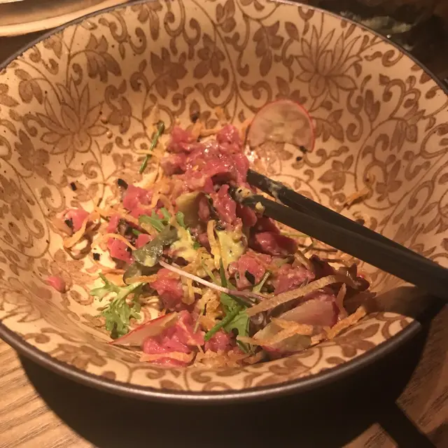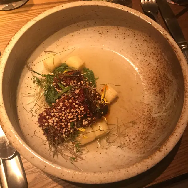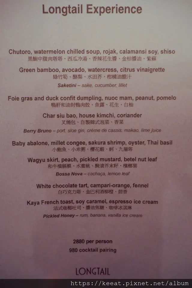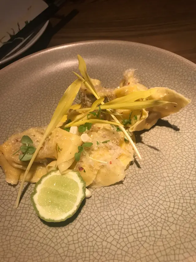 B哥的邀請再次盛情難卻~~喬了個年假尾聲順勢與好友們聚餐,新Chef Erik陳加朗上任(歷RAW、FRASSI),近期推出了新套餐,幾道有帶入發酵的元素,朋友給了我她對這餐的記錄如下,其餘我再對照片做點補充。新主廚Erik在小食方面優秀且走出自己風格,尤其是泰式鹹水角和蟹味噌蝦春卷。泰式鹹水角,皮薄微辣、綠咖喱肉餡噴香,頗有特色,與一般港式不同,多了一些耐人尋味的風韻,整體融合度與完成度堪稱佳品。蟹味噌蝦春卷在撇油上做得很不錯,蝦與豬板油的內餡加入蟹味噌,調和鮮潤不膩口,值得推薦!至於套餐,主餐的鴨胸表現蠻好,沒有禽類的腥羶味,柔美多汁。(單點菜單,不過這次吃到的是新單點菜色,即前面所提~泰式鹹水角和春捲)(開胃小點三道: 育空黃金馬鈴薯/生蝦塔塔/拇指檸檬/烏魚子、帝王蟹腿/櫻花蝦/鎮江醋、風乾番茄/瑞可塔起司/羅勒康普茶/金華火腿)(Cocktail第一杯,刺蔥、金桔..帶果乾與醃燻香氣)干貝/芹/XO醬,柑橘花蜜醬汁、西芹醋大黃瓜泡沫,以及醃漬乾蔥,XO醬僅表面薄薄一層麵包的蒜香麻油抹醬倒是頗得眾人歡心,抹得一乾二淨甲魚/季節時蔬,老母雞、金華火腿製作的甲魚澄清湯,烤冬筍與甜豆仁鮑魚/蠔/酸白菜,上面那層是湯葉,有點兒仿餛飩的意味,還灑了一些蝦籽粉,但詢問外場則說這道是酸菜魚發想,湯葉切開後搭著乾煎生蠔與高湯煨鮑魚,墊底的是自製酸白菜鴨/黑蒜/晚香玉筍😋,水田芥泥、野菇泥、黑蒜鴨汁醋,大家幾乎都喜歡當晚熟成鴨胸的口感處理,用低溫炭火慢烤、皮脆而肉嫩,晚香玉筍則是發酵過,第三杯波特酒調製的我覺得有對味,帶蘋果酸與茶樹菇香氣,略甜些~泰式鹹水角😋,綠咖哩豬肉餡的辛辣度夠、且整體調味不無聊蟹味噌蝦春捲,番茄羅望子椰糖sauce,一查之下才知道Erik原來是曼谷出生..)菠蘿包,辣沙丁魚、松露奶油、漬黃瓜片,這道明顯要再調整一下謝貓人分享從鯷魚餐廳帶來的bonbon巧克力杏/梨/燕窩,杏仁茶冰淇淋、杏仁餅、慢燉西洋梨,還不錯的甜點…查看更多