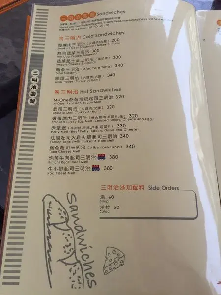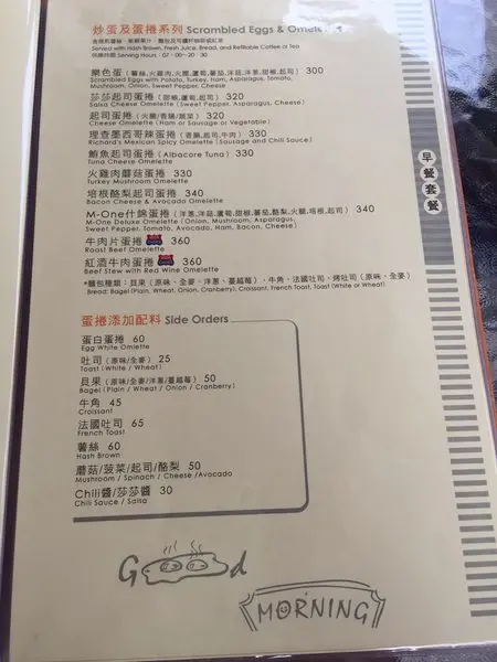 與好友約會不知道約哪邊,而朋友詢問我M One Cafe要不要嘗試看看,是有早午餐、義大利麵的選擇我馬上就答應了!不過其實吃完後是覺得價格挺高東西就普普通通當天下大雨所以我們就直接進去店內,用完餐因為挺失望地就忘了沒拍門面了(抱太大期望?!),進去店內黑黑的很像是酒吧般,用餐時間限制90分鐘...而廁所只有一間常常要等....客人非常非常的多不訂位應該也要等個幾個小時,兩個座位間距很小聽得到隔壁人到底在聊什麼,整間店內聊天的聲音也挺大聲的,需要好點聽力去聽朋友在講什麼....,翻菜單的時候也才發現這是有名的"橘色涮涮屋"旗下的西餐店我們點了煙燻鮭魚班尼迪克蛋 360元(附現煎薯絲、新鮮果汁、優格、續杯飲品咖啡/紅茶)、理查墨西哥辣蛋捲 350元 (附現煎薯絲、新鮮果汁、麵包、優格、續杯飲品咖啡/紅茶)以下是附餐所有的飲品,咖啡是朋友點用所以沒有品嘗,果汁還算蠻甜的紅茶其實喝起來就是紅茶表現一中規中矩蛋捲附的麵包我選擇了 可頌,因為我自己本身就很愛可頌所以口感酥口還算蠻香的挺不錯的理查墨西哥辣蛋捲 350元 (附現煎薯絲、新鮮果汁、麵包、優格、續杯飲品咖啡/紅茶)我其實看到這樣的擺盤我傻了,整盤看起來就黃色系列少了些點綴,看起來很普通沒有讓我覺得好像很美味的感覺切開後我覺得蛋捲根本全熟,熟透的讓我覺得沒有想快點入口的衝動,上方的墨西哥辣肉醬吃起來微微的辣且味道挺重的,就如外面一般常吃的到的"墨西哥辣肉醬"口味,蛋捲部分除了熟透像玉子燒口感外沒有什麼特別香氣及味道,所以一定得搭配醬料享用才有點變化,但整體我其實很失望....薯餅外皮煎至酥脆不油膩,比起蛋捲還出色多了優格的部分搭配了燕麥片我覺得還算不錯,微微的甜我能接受,不過這一份搭配兩杯飲品要價350我覺得實在有些高價就是了,雖然說吃得飽....但我更注重讓我覺得舒適又不錯的環境及食物煙燻鮭魚班尼迪克蛋 360元(附現煎薯絲、新鮮果汁、優格、續杯飲品咖啡/紅茶)不過班尼迪克蛋我們都覺得似乎就更中規中矩了,搭配的荷蘭醬沒什麼味道、香氣而煙燻鮭魚的口味也是一般外面可吃的到的,底下的英式馬芬麵包體稍乾了些,搭配蛋汁和荷蘭醬就濕潤些!雖然說好像在台北鬧區用餐的價格大概都這樣,但是因為我個人比較注重用餐的感受、環境及餐點兼具,所以才覺得價格很高!…查看更多