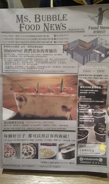 Ms.Bubble Cafe & Handmade (台北) 網址: https://s.openrice.com/cHRSm02Pgm400 地址: 台北大安區永康街75巷16號 電話: +886 022351156