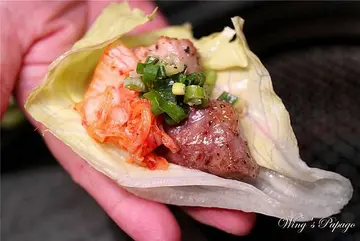 王品旗下燒肉品牌專門店【原燒 O-NiKU】,近期推出新菜色,還有多款主廚私房配菜,提供多樣化的選擇,是想吃美味質感燒肉時的好處所。  【原燒 O-NiKU台北林森北店】近捷運中山站,步行約7分鐘左右可達,店面位在二樓,一進門可看到原燒字樣的植栽牆。 點餐方式以套餐為主,我們今天點的是雙人2,288元(另加10%)的逸品盛合套餐。【沁檸氣泡飲】【葡萄可爾必思氣泡飲】套餐飲品選了沁檸氣泡飲及葡萄可爾必思氣泡飲,一杯份量還蠻多的。  藍色的沁檸氣泡飲及紫色葡萄可爾必思氣泡飲色澤夢幻誘人,酸香清甜,多了氣泡的口感,喝來冰涼沁心。  【日式豚骨湯】一入座服務人員會先倒上日式豚骨湯,裝在保溫壺裡保溫可自行加取,豚骨湯頭香醇甘甜,清香順口。  【岩燒蒜片鮮蔬沙拉】沙拉有胡麻醬及和風醬兩種可選,我們選了胡麻醬,一碗份量不少,有多種新鮮生菜、海苔,上頭再放上大量岩燒蒜片提味,搭配香濃胡麻醬,清爽又開胃。  【韓式泡菜、蔥鹽、大根】三種基本私房配菜有韓式泡菜、蔥鹽、大根,可自行搭配燒肉呈現多種吃法。  【醃漬黃檸檬、蒜頭辣椒、黃綠櫛瓜】近期更推出了醃漬黃檸檬、蒜頭辣椒、黃綠櫛瓜三種主廚私房新配菜,酸香夠味,自由搭配燒肉更加美味。  【墨西哥餅皮+包菜葉】附餐附上墨西哥餅皮及包菜葉,可將燒肉包覆在內食用口感更豐富。  【鮭魚鬆飯】【照燒鮮貝飯】飯類各選了鮭魚鬆飯及照燒鮮貝飯,兩種皆灑上大量海苔絲,小干貝嚐來脆口,米飯吸收照燒醬香氣十足;鮭魚鬆飯拌勻後食用有鮭魚鮮美海味。  主餐提供12種肉品,一次送上桌,擺盤精緻,看起來好豐盛啊!  這四格有壺漬牛、厚切牛五花、角切牛、椒鹽松阪豬。  大片的5oz肋眼牛排、蒜香橫膈膜、特級霜降牛、梅花骰子豬。  極選澳洲和牛、特級霜降牛、伊比利豬梅花、蔥鹽牛舌、嚴選松阪豬,附上蒜泥調味料。  【5oz肋眼牛排】首先由店長來幫我們烤這片厚實頗具份量的5oz肋眼牛排,烤至半生熟後服務人員會先將老饕牛排部分切下再燒烤後切塊。  老饕部位油脂豐富,趁熱吃軟嫩可口,不用太多調味,呈現食材最自然的原始鮮甜味,細細咀嚼,油花散開呈現鮮嫩多汁感,又香又好吃。  肋眼牛排的另一部位肉質色澤粉嫩,嚐來肉汁豐富,鮮嫩美味!  【蔥鹽牛舌】牛舌烤好後上頭再放上店家特製的蔥鹽,Q彈的牛舌和蔥鹽完美結合,嚐來帶有蔥鹽鹹香,好吃沒話說!  【梅花骰子豬】肥瘦相間的梅花骰子豬先四面烤熟再移到旁邊等中間烤熟,搭配酸香泡菜入口,肉質厚實美味,帶點油脂香氣。  也可將骰子豬配上泡菜、蔥鹽,滋味也是十分美妙。  【伊比利豬梅花】伊比利豬梅花肉質紮實有彈性,放點蔥鹽提味味道就很鮮甜。  將伊比利豬梅花放在墨西哥餅皮上再包入醃漬黃檸檬、蒜頭辣椒、黃綠櫛瓜三種配菜,吃來滋味豐富,酸香夠味。  【特級霜降牛(薄)】逸品盛合套餐的特級霜降牛有薄及厚兩種,先烤薄的霜降牛,油花細緻,入口富含豐富油脂,軟嫩可口。  也可將特級霜降牛搭配醃漬黃檸檬、蒜頭辣椒、黃綠櫛瓜,口感更有層次,獨具風味。 【原燒 O-NiKU】服務人員會不時關注客人需求及收拾桌面,適時提供桌邊服務,態度親切客氣,讓人印象深刻,今日品嚐的逸品盛合燒肉套餐內容豐富飽足,精緻度及美味度都讓我們很滿意, 推薦給喜歡高品質燒肉的人參考。 想看更多美食記錄請見wing的自助行腳趴趴GO!  http://wing1209.pixnet.net/blog查看更多