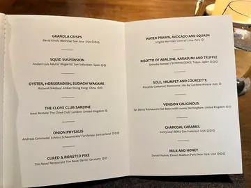 這一季的Raw網羅28顆星星的菜色(包括它自己2顆),早在公佈時就引發話題,多虧龍哥再次包下主廚桌,讓本鄉巴佬又可以跟團,Raw不愧在行銷方面有兩把刷子,帶給人的體驗的確不只是享用料理而已,而且這次試了wine pairing還蠻搭的,如果沒喝酒可能不夠完整,這一年之中三次造訪,純就美味度的感覺:年度精選>=World Tour III>Andre is back,World Tour III則是相當特色,但價格真的高,6,600+1,400(兩人share一套pairing)。(魷魚遊戲?)😂(法式澄清滴雞精)非常純淨又有醇厚感的開場白。(第一支配脆餅,花香調性、尾韻礦物微鹹感)(Granola crisps,Manresa,三星)綜合穀物堅果脆餅夾心山羊乳酪,帶一點點羊騷味兒,可能有的人會說"愈騷我愈愛!",我是沒辦法太騷的😅,那股羊乳酪的厚郁必須搭酒,味道才足夠變化。(第二支有柑橘草本香氣的酒,搭生蠔料理)(Oyster/Horseradish/Sudachi wakame,Amber,二星)味覺漸進,從上方棉花糖的醋橘酸(金桔柚子)帶到海藻粉和海水醬汁的海潮鹹味,再來則是生蠔(吉拉朵)的礦質感和清冽,也是必須搭酒,頗喜歡~(The clove club sardine,The clove club,一星)說是炸魚薯條的概念(但魚沒炸呀?😂),外場說chef本身是漁夫,所以這道是招牌魚料理,取經於日本,建議要沾多一點醬,漬沙丁魚的酸味以伍斯特美乃滋來包覆柔和,放薯片上面一起吃(聞起來不像單純的薯片),總之是還挺好吃,這樣包起來從外到內,嚐起來有層次。(麵包此時上桌)(有莓果香的粉紅酒,搭接下來的"檸檬醃魚")(Onion physalis,Schloss Schauenstein,三星)色彩鮮艷的沙拉,用洋蔥甜菜根調配的天然紫色,裏頭有橘色辣油和綠色蔥油,帶入Ceviche概念,整盤酸勁蠻濃的,當作吃個纖維質補充一下。(就是黃酒味,要搭接下來的魚,只配這道餐)(Cured & Roasted pike,Restaurant Tim Raue,二星)這道是當天前三喜歡的菜,妙在底下魚露燻香的sauce(類似起司、發酵香味)以及西谷米,西谷米摻了小黃瓜、中意這口感,鱸魚則偏熟、屬想像得到的正常好吃,還是驚艷在sauce。(Water Prawn/Avocado and squash,Central,最佳50餐廳之一)這道就是很直覺的好吃,甜蝦與蝦膏非常充足、非常鮮美,南瓜泡泡、酪梨脆片、北海道海膽,還用了一點祕魯辣椒醬,讓整體不會只有鮮與甜的死板。(Risotto of abalone, karasumi and truffle,L’Effervescence,三星)也是很喜歡的燉飯,使用仙台米、非米心口感但有彈性,鮑魚、烏魚子、義大利松露,風味柔和優雅。(蠟封鴨肝,Raw,二星)整體就是很蜜很蜜也相當肥腴~連搭配的吐司都帶點甜,還好有茶可以解膩,雖這樣想,但也不代表不喜歡這道菜,對我來說,吐司可再多一條。(誰的手??)😂(Sole, trumpet and courgette,Ristorante Lido 84,一星)板魚抹上櫛瓜芥末sauce,葡萄、芳香萬壽菊,很有草本味的白肉魚,友人說味道非常歐洲風。(有野味的酒感、漿果味)(Venison caliginous,Restaurant Sat Bains with rooms,二星)當日主菜鹿肉塔塔,用了暗喻:掀開疫情的黑幕(蕈菇製成)後將會迎來繽紛,鹿肉以生、煎、炸三種方式,一點都不老柴而且有咬感趣味。(Charcoal caramel,BENU,三星)說實在很喜歡這道甜點,泥煤威士忌發酵奶、類似奶酪,微帶鹹度,可是我始終覺得這股氣味無法讓我吃多,三口足矣。(Milk and honey,Eleven Madison Park,三星)朋友覺得太甜,但少吃甜食的我卻認為這樣結尾的甜度非常開心!查看更多