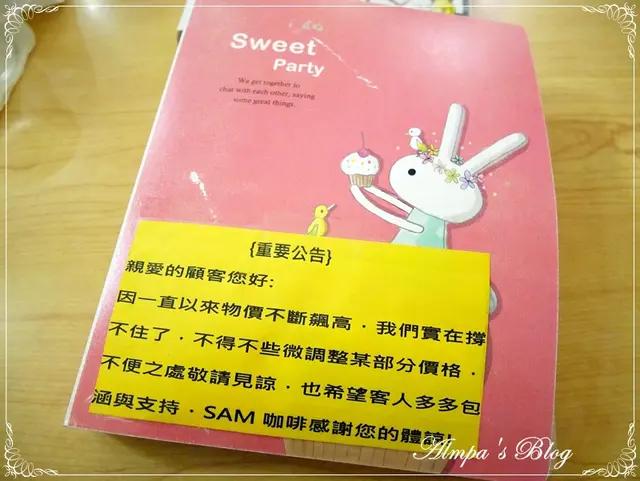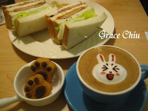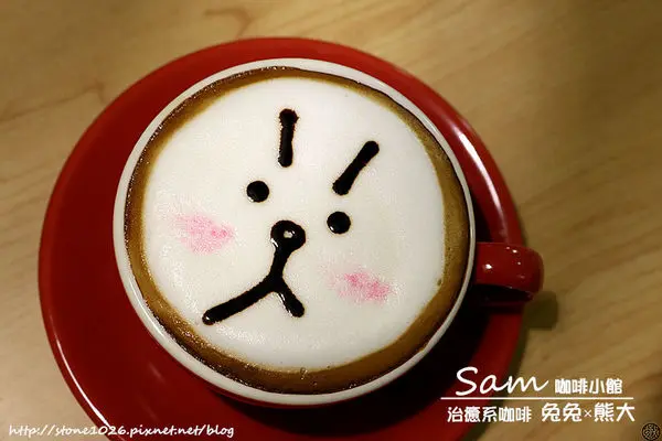 天啊我幼稚死了幼稚死了幼稚死了某天友人上網時發現有一家咖啡廳作出熊大與兔兔拉花咖啡就趕緊拿給我看不看沒事,看了我就不舒服想馬上噴去親自瞧一瞧才甘心畢竟~我對熊大兔兔是有感情的.....,Sam咖啡位於南京東路五段250巷內,附近沒有捷運,搭公車要在南京公寓站下車,走過來大約8分鐘老實說這間咖啡廳的外型一點都無法吸引我,位置也不是特別好,要不是有特色拉花我可能永遠不會進去XD我有事先電話預約,店家安排我坐窗邊,與這兩隻一起坐哈哈哈哈哈哈哈哈進到店裡就立馬把玩起Ted與毛怪,忙著幫它們橋pose拍照這樣整個很busy,弄了大概有10分鐘....不過實在是太可愛了啊你們說是不是!!快門non-stop啊Ted因為熊麻吉這部電影紅透半邊天,那倒楣的八字眉讓它看起來永遠很憂鬱又很好笑等待咖啡的時間來看一下店家環境好了(菸)吧台與開放式廚房佔了整間店有三分之一,很家庭式的風格四周堆了很多東西,有種說不出的凌亂感...不過整體還是相當乾淨明亮的接待我的小姐也很客氣有禮,看我在那邊弄很久只是一個勁兒的笑XD全店大概就這樣子,約可容納20-25人左右,可以看到除了毛怪、Ted還有拉拉熊在入口進門的地方還有大眼仔與其它可愛小公仔喔科科~這是之前全家商店推出的熊大&兔兔筆我也有XD一旁還有史奴比與Teddy Bear(?),就是一間企圖以各種卡通人物收買人心的咖啡館,意圖相當明顯不過就是奏效了,就是有像我這樣的人啊.....哈哈哈哈哈哈哈哈Sam提供的餐點非常多樣,咖啡、茶、果汁、潛艇堡、總匯三明治、鬆餅、沙拉、簡餐飯麵與蛋糕甜點價格非常親民也不收服務費,開水自己倒不用客氣,當然也有free wifi,低消是每人一杯飲品我想~最可惜就是限時2小時吧熊大歐蕾咖啡$100歐蕾咖啡就是奶比較多的咖啡,也可以說就是拿鐵啦!表情使用巧克力醬畫上的,可以放心飲用哈哈哈哈哈哈哈超像的啦!!!一臉ㄘ凹ˋ賭賭的熊大咖啡到手兔兔卡布咖啡$100卡布就口感苦一些,奶泡打得很細緻耶~你們覺得像嗎?眉毛好像可以再長一點對不對?鼻子的範圍好像要再大一點吼XD光這兩杯咖啡就拍了不知道幾十張照片,超神經的,女人的錢真好賺ㄟ!!!這是一篇很幼稚的咖啡文章,沒有什麼參考價值哈哈哈哈哈,純自爽(菸)掰!…查看更多