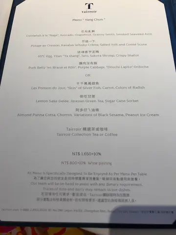 Tairroir為台北米芝蓮三星餐廳🌟🌟🌟,以台灣本土特色食材為主,研發出一系列精緻料理盛宴。.🍴Lunch menu “Pong Pai” NT$3,880.▫️餐前小食 - 紫菜鮮蠔脆卷 🦪蠔肉大而鮮美多汁,卻不會令外層變軟,新鮮一出爐便立即送上餐桌,保持最鬆脆口感!.▫️餐前小食 - 青瓜青萍果脆批 🥒酸甜口感一解脆卷油膩,不過不失。.▫️三十而栗 🌰第一道菜已經被驚艷!幼滑濃湯以茶杯形式呈現,表層泡沫以淡淡油脂配襯出多層次濃湯,旁邊的小批亦穌脆無比,一查才得知主廚於2021年曾獲得Asia Best Pastry chef🧑‍🍳 .▫️蟹逅 🦀以大量北海道毛蟹肉製成,配以牛油果醬配搭出清新又creamy口感。.▫️迷魂香芋泥鴨 🦆以半熟蛋及芋泥為基底,加入香口材料如鴨肉乾、櫻花蝦等增強口感層次,特別又創新!.▫️秋水伊人 🐠以西式手法烹調魚肉,魚肉細膩,另有中式醬汁增強鹹香味道。.▫️彘手可熱 🐖台灣山豬肉以半熟形式烹調,厚實有咬口,另配一口份量山豬肉丸糯米飯呈現兩種食法。.▫️龍蝦炒飯 🦞 (+NT$1600)以原隻龍蝦肉十分足料,炒飯味道與鐵板燒炒飯相近,不算有太大驚喜。.▫️優墨芒果 🥭芒果雪葩中加入清酒中和甜味,再配以乳酪微酸味解膩。.▫️桔光苒苒 🍊另一驚艷之作❣️以豆乳製作panna cotta ,豆味超級濃郁!再加以脆脆及雪糕多重口感又有特色👍🏻.💬 整個午餐體驗將近2.5小時,以價錢來講絕對值回票價,菜品種類豐富之餘又有特色,服務亦滿分💯.Tairroir is a three-star Michelin restaurant in Taipei, renowned for its use of Taiwan's local ingredients to craft an array of exquisite culinary feasts..🍴 Lunch menu “Pong Pai” priced at NT$3,880.▫️ 𝐀𝐦𝐮𝐬𝐞 𝐁𝐨𝐮𝐜𝐡𝐞 - 𝐂𝐫𝐢𝐬𝐩𝐲 𝐒𝐞𝐚𝐰𝐞𝐞𝐝 𝐎𝐲𝐬𝐭𝐞𝐫 𝐑𝐨𝐥𝐥 🦪Generously sized, juicy oysters encased in a crispy layer that remains firm, served fresh for a delightful crunch!.▫️ 𝐀𝐦𝐮𝐬𝐞 𝐁𝐨𝐮𝐜𝐡𝐞 - 𝐂𝐮𝐜𝐮𝐦𝐛𝐞𝐫 𝐚𝐧𝐝 𝐆𝐫𝐞𝐞𝐧 𝐀𝐩𝐩𝐥𝐞 𝐂𝐫𝐢𝐬𝐩𝐲 𝐓𝐚𝐫𝐭 🥒Balances the previous dish's richness with a refreshing, tangy taste..▫️ 𝐂𝐡𝐞𝐬𝐭𝐧𝐮𝐭 𝐒𝐨𝐮𝐩 🌰The first dish is astonishing! A silky, tea-cup-shaped soup with a foam top delicately layered, accompanied by wonderfully crispy bread. The revelation that the head chef was awarded Asia's Best Pastry Chef in 2021 adds another level of appreciation.🧑‍🍳.▫️ 𝐂𝐫𝐚𝐛 𝐀𝐝𝐯𝐞𝐧𝐭𝐮𝐫𝐞 🦀Crafted with abundant Hokkaido crab meat and paired with avocado sauce, creating a fresh and creamy texture..▫️ 𝐄𝐧𝐜𝐡𝐚𝐧𝐭𝐢𝐧𝐠 𝐓𝐚𝐫𝐨 𝐃𝐮𝐜𝐤 🦆Combining semi-cooked egg and taro paste with textured elements like dried duck and sakura shrimp for a distinct and innovative dish!.▫️ 𝐀𝐮𝐭𝐮𝐦𝐧 𝐖𝐚𝐭𝐞𝐫'𝐬 𝐋𝐨𝐯𝐞𝐫 🐠A Western-style preparation of fish, rendering a delicate fish texture with added depth from the Chinese-style sauce..▫️ 𝐒𝐢𝐳𝐳𝐥𝐢𝐧𝐠 𝐏𝐢𝐠'𝐬 𝐇𝐚𝐧𝐝 🐖Taiwanese wild boar cooked in a semi-cooked form, presenting a robust texture, complemented by a side of glutinous rice with wild boar meatballs offering two different culinary experiences..▫️ 𝐋𝐨𝐛𝐬𝐭𝐞𝐫 𝐅𝐫𝐢𝐞𝐝 𝐑𝐢𝐜𝐞 🦞 (+NT$1600)A generous amount of whole lobster meat in the fried rice, resembling teppanyaki-style fried rice but lacking a surprising element..▫️ 𝐌𝐚𝐧𝐠𝐨 𝐒𝐨𝐫𝐛𝐞𝐭 🥭Mango sorbet infused with sake to balance sweetness, paired with a slightly tangy cheese for a refreshing finish..▫️ 𝐒𝐨𝐲 𝐌𝐢𝐥𝐤 𝐏𝐚𝐧𝐧𝐚 𝐂𝐨𝐭𝐭𝐚 🍊Another stunning creation! A panna cotta made with soy milk, exuding a rich soy flavor, complemented by various textures and a unique touch.👍🏻.💬 The entire lunch experience lasted nearly 2.5 hours and undoubtedly justified the price. The variety and uniqueness of the dishes, coupled with exceptional service, earned a perfect score!💯查看更多