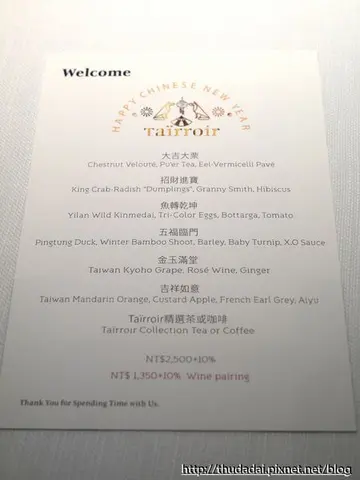 年假結束的那個周六正好J女有空閒,便安排態芮+祥雲龍吟的一天食程,Taïrroir這個名稱是Taiwan+Terrior(風土)之意,可見其料理特色,不過當周仍被歸類到年假期間的特別菜單(2,500+10%),就沒有我原本想品嚐的迷魂香芋泥鴨了。 態芮在美麗華旁的EAT-T大樓,與隔壁的赫士盟大樓集聚了不少名店,位在六樓一出電梯門立即就可見到櫃台bar、以及用餐區域,店面不大,服務人員立即上前接待,展現出來的服務細緻度、氣質皆可謂水準之上,餐廳很具有特色的裝潢擺飾是位在天花板的格子銅片,像是某種零食(?),當日菜色則很有年節的氛圍,大吉大栗、招財進寶、魚轉乾坤...選的是法國orezza氣泡水,這瓶要價不斐,麵包是與吳寶春特製的合作款,小法棍和紅藜麥,在加熱後展現的香氣和質感都不錯,吃不夠可續。第一道大吉大栗,乍看像是傳統的喝茶配甜點,其實是以栗子與普洱為元素製作的湯品,滋味濃醇的法式濃湯,還加了少許辣粉表現反差,一旁的"甜點"則是鰻魚麵線,似押壽司做成立體狀,麵線口感軟Q、黏而不糊,但整體調味偏淡,沒有所謂的"古早味"了。第二道招財進寶,以黑蘿蔔、西瓜蘿蔔夾著鱈場蟹肉,經過一些調配而展現鹹鮮的滋味,兩色醬汁分別為青蘋果薑、洛神花,正想著與招財進寶此名稱有何相干?後來猜想或許是做成半月型的類元寶狀吧~第三道魚轉乾坤,香煎金目鯛、烏魚子、以及盤底薄薄的一層墨魚蒸蛋,所謂墨魚蒸蛋指的是加了部分的墨魚汁,有如一幅畫似的,搭配的醬汁是番茄醬,顏色偏金黃,酸少而略甜,魚肉火候固然是不錯的,而那烏魚子的搭配與當晚祥雲龍吟的第六道竟有幾分相似,蠻有趣的。第四道主菜五福臨門,屏東鴨的煎鴨胸,有脆、肉質也不錯,單就肉的呈現略遜於最近在巴黎廳吃的,不過sauce有特色,除原本淋上少許的鴨骨醬之外,應用了紅麴豆腐乳做的醬,鴨肉本屬野味常見以甜味醬料來搭配,紅麴腐乳醬獨特的香氣與鹹甜味搭起來不錯吃,底部的XO醬薏仁燉飯口感很好,微辣而且氣味很香,有些亮眼,冬筍和小蕪菁也甜美。第五六道都是甜品,金玉滿堂是巨峰葡萄冰沙,底部為檸檬與薑製成的果凍,旁邊是乾燥白木耳,樸實好吃,吉祥如意以桶柑果肉為主軸,加入了伯爵茶、愛玉、鳳梨釋迦等元素,味道的調和度不錯。用茶時間還附贈了兩樣小點心,酒釀桂花發粿與蘭姆酒葡萄年糕,有趣有特色且味道也蠻好的,發粿比較可惜水分稍嫌過多。這餐單以料理算是不錯吃且有特色,尚稱不上驚艷,但就整體的用餐經驗是令人舒服的。查看更多